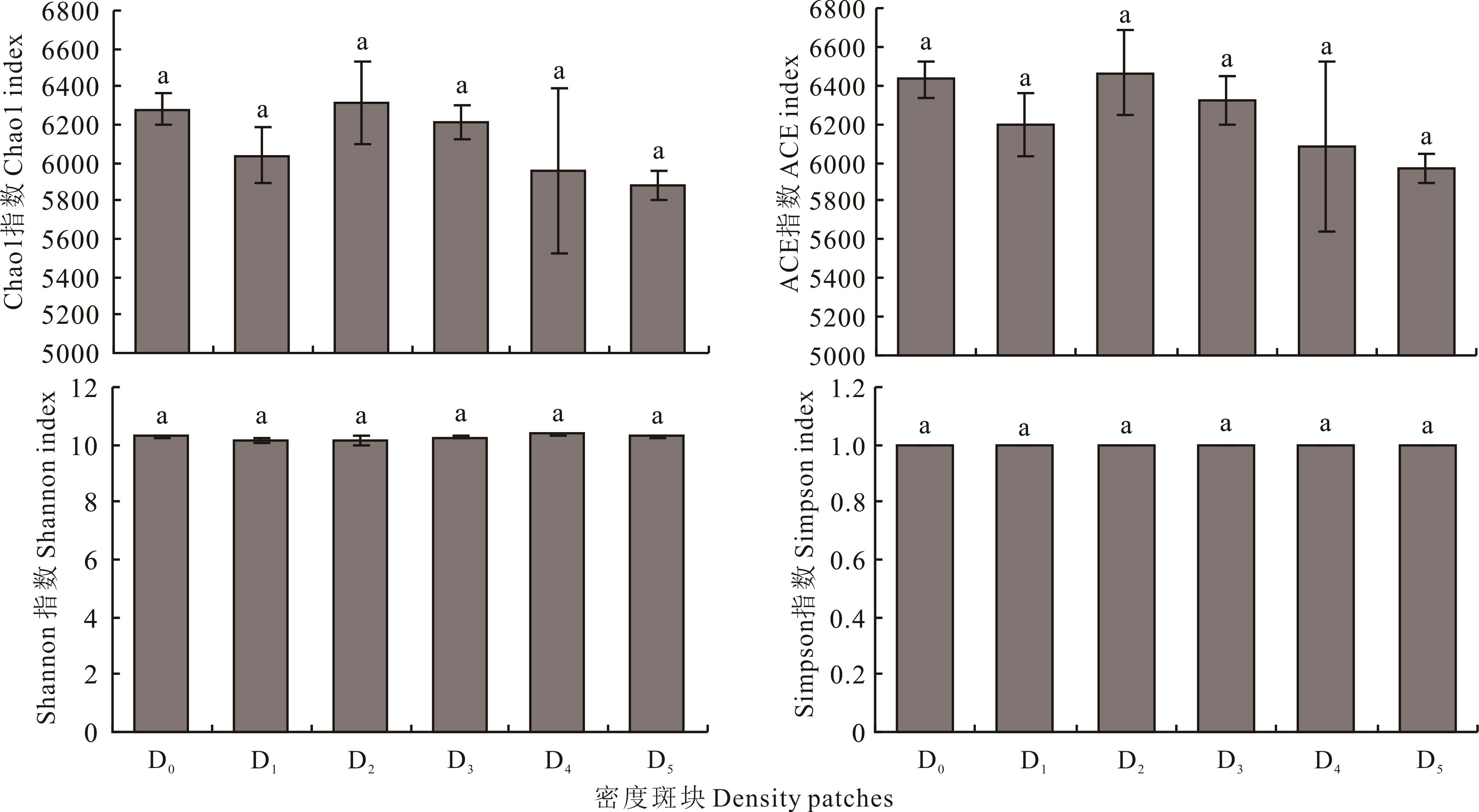 图4 不同黄帚橐吾密度斑块土壤细菌群落α-多样性不同字母表示差异显著(P<0.05)。Different letters meant significant difference at P<0.05 level. 下同The same below.