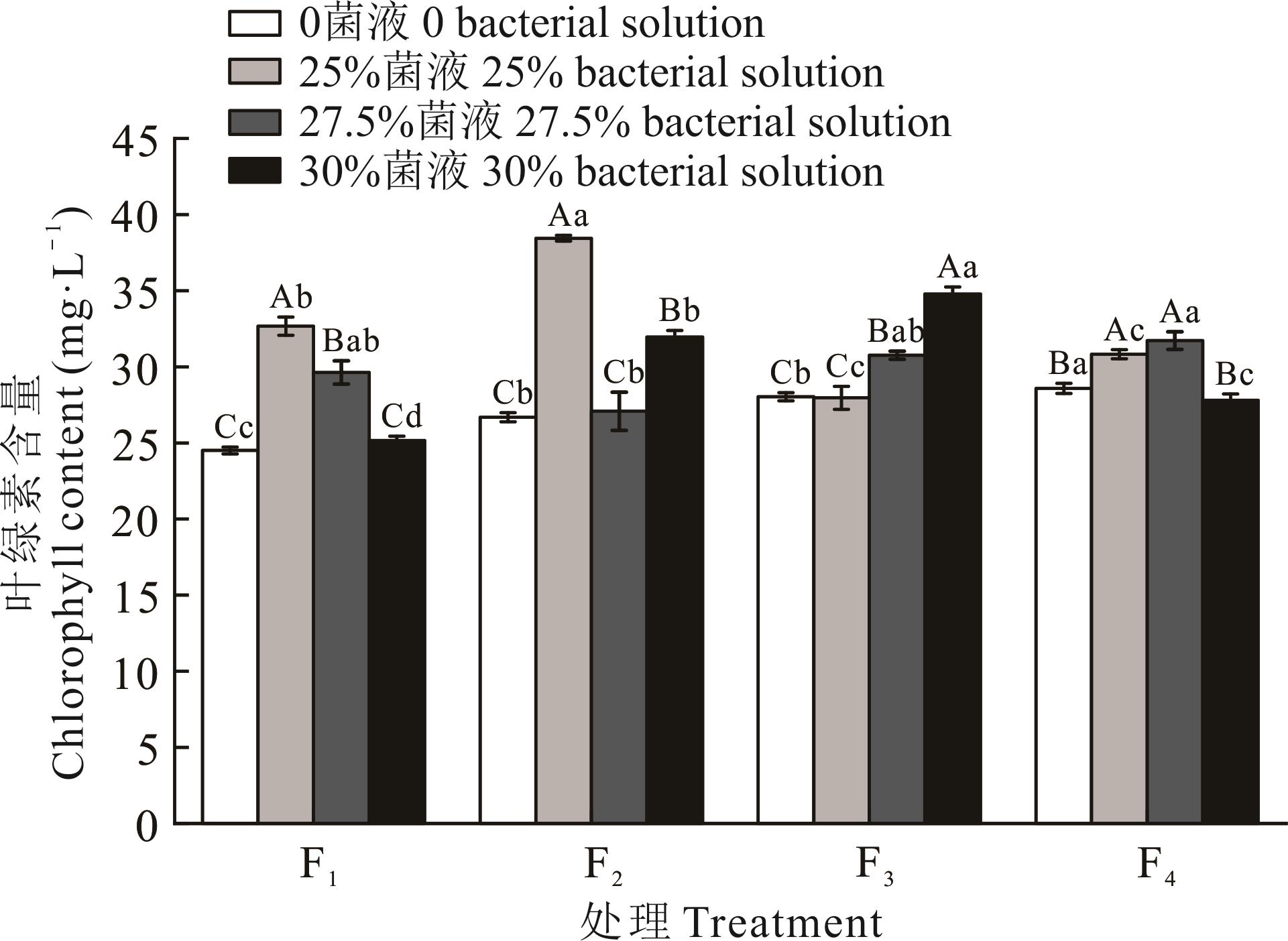 图3 不同处理菌肥对紫花苜蓿株高的影响不同大写字母表示在同一载体处理下不同菌液浓度处理之间差异显著(P<0.05),不同小写字母表示在同一菌液浓度处理下不同载体处理之间差异显著(P<0.05),下同。The capital letters represent the significant differences (P<0.05)among different bacterial solution concentrations treated with the same carrier, and the lowercase letters represent the significant differences (P<0.05) among different carrier treated with the same bacterial solution concentration, the same below.