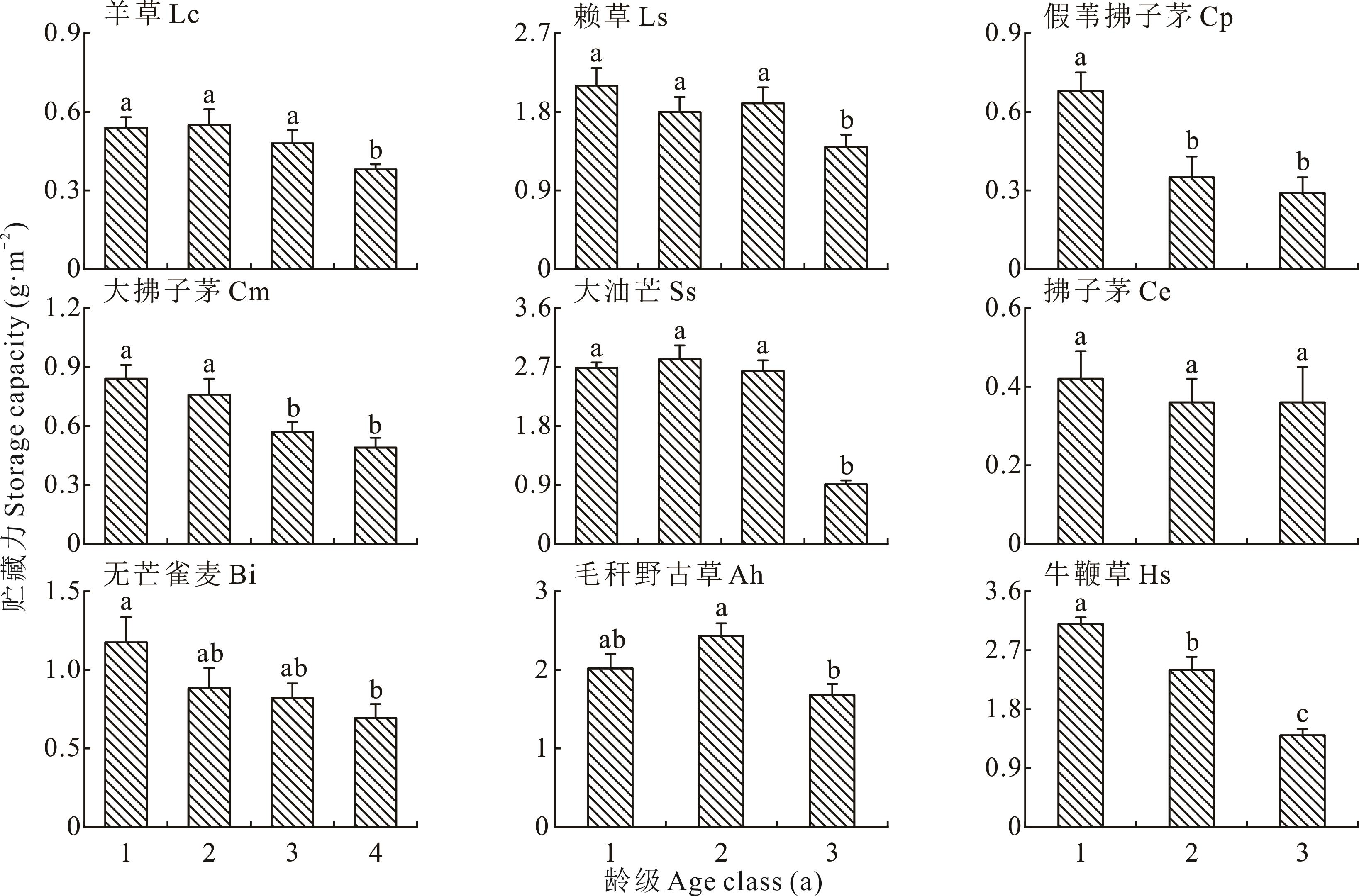 图1 3种利用方式草地12种根茎禾草种群分蘖株的年龄谱Lc: 羊草L. chinensis; Am: 根茎冰草A. michnoi; Bi: 无芒雀麦B. inermis; Cm: 大拂子茅C. macrolepis; Ce: 拂子茅C. epigejos; Cp: 假苇拂子茅C. pseudophragmites; Ah: 毛秆野古草A. hirta; Hb: 短芒大麦H. brevisubulatum; Hs: 牛鞭草H. sibirica; Ag: 光稃香草A. glabrum; Ls: 赖草L. secalinus; Ss: 大油芒S. sibiricus; G: 放牧场Grazing pasture; H: 割草场Mowing meadow; E: 围栏封育草地Fenced enclosure grassland. 所有数据来源于文献[3,5-36]。All data are from References [3,5-36]. 下同The same below.