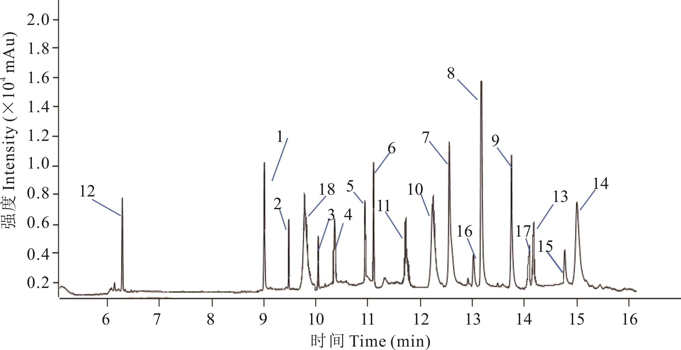 图2 优化色谱质谱条件后18种真菌毒素总离子流1: AFB1; 2: AFB2; 3: AFG1; 4: AFG2; 5: AFM1; 6: AFM2; 7: OTA; 8: OTB; 9: OTC; 10: T-2; 11: HT-2; 12: DON; 13: FB1; 14: FB2; 15: FB3; 16: ZEN; 17: D3G; 18: 15-ACDON.