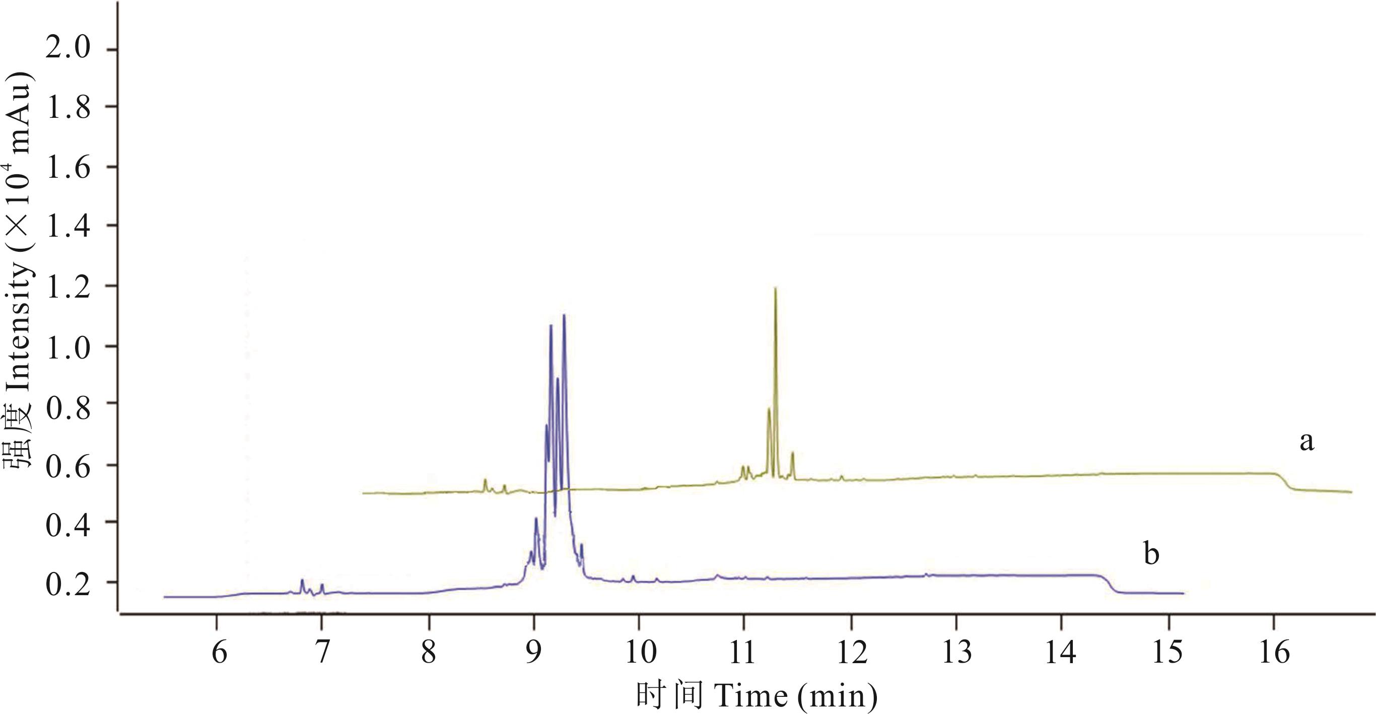 图3 采用基质匹配标准溶液条件下15-ACDON色谱a: 与基质匹配的标准溶液Matrix-matched standard solution; b: 未处理的标准溶液Untreated standard solution.