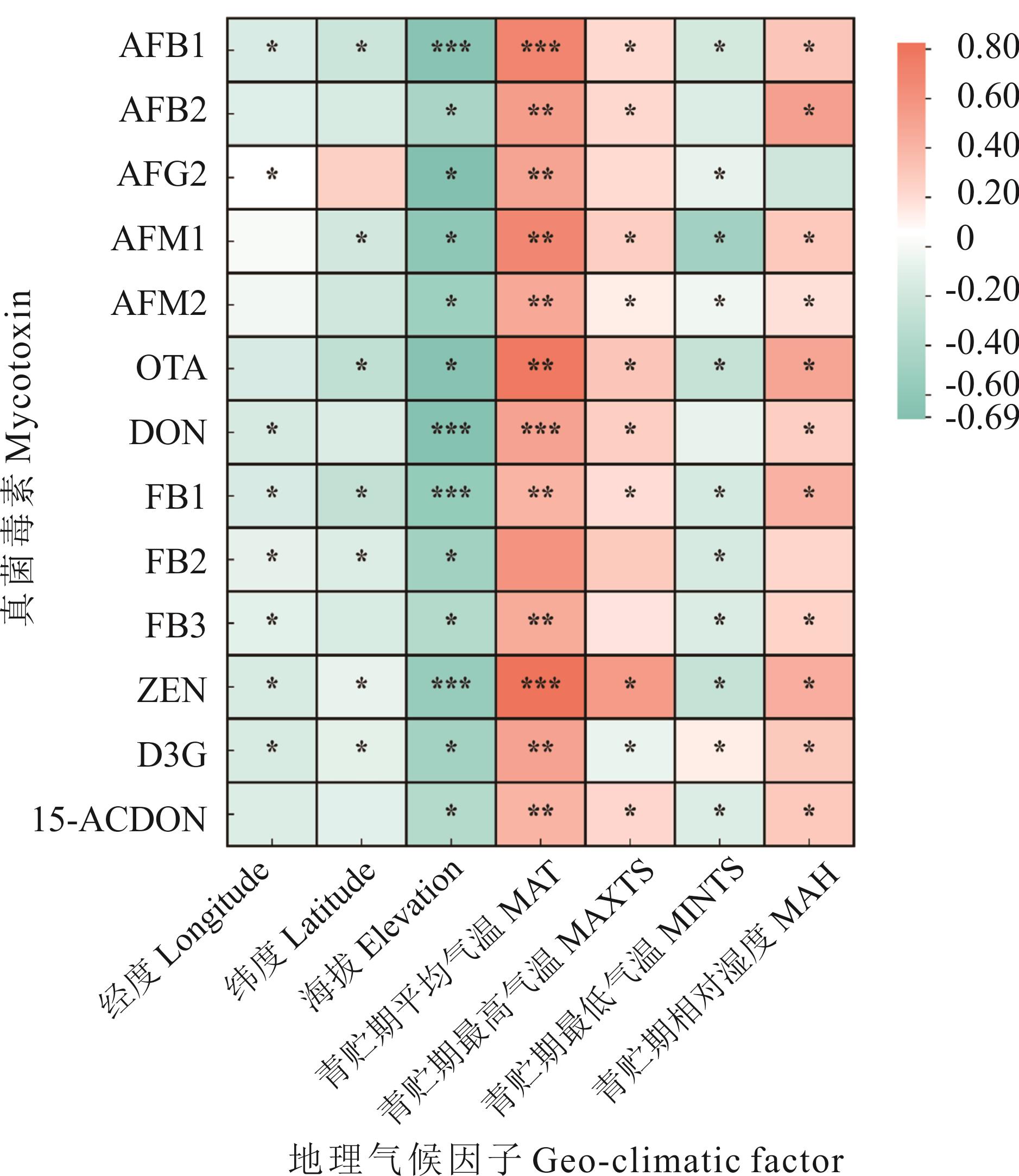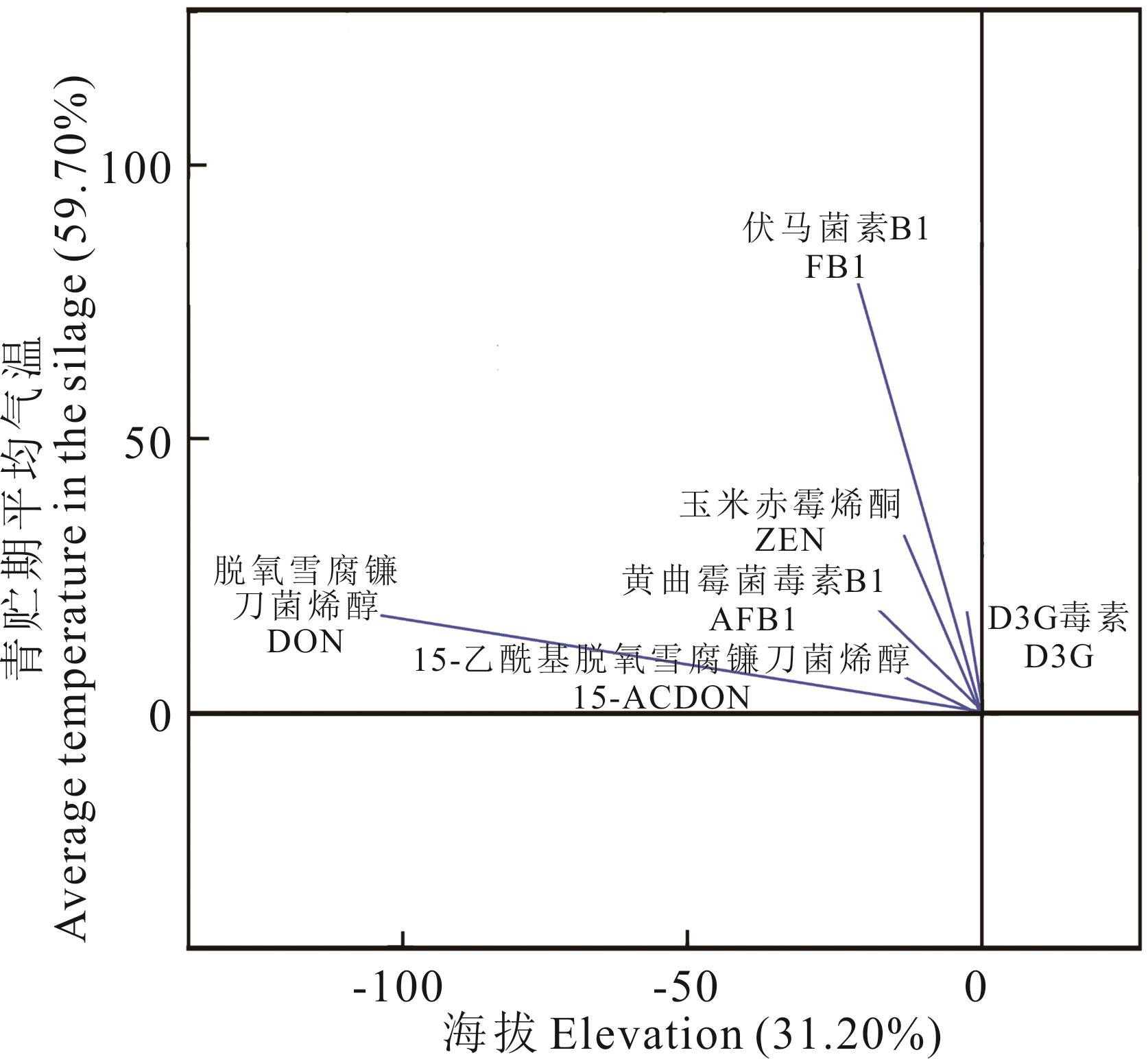 为了解甘肃省内青贮紫花苜蓿饲料中真菌毒素污染状况,本研究采用超高效液相色谱-四级杆/静电场轨道阱高分辨质谱法(UPLC-Q-Orbitrap HRMS),通过优化色谱、质谱条件,选择凝胶渗透色谱(gel permeation chromatography, GPC)与固相萃取(solid-phase extraction, SPE)双重净化模式降低基质效应,对甘肃省内14个地(州、市)84个取样点的青贮紫花苜蓿饲料中18种真菌毒素进行了检测。结果显示:本研究中优化后的UPLC-Q-Orbitrap HRMS可一次性精准检验青贮紫花苜蓿中18种真菌毒素。甘肃省内青贮紫花苜蓿中检出率较高的真菌毒素分别是黄曲霉毒素B1(aflatoxin B1, AFB1)、黄曲霉毒素B2(aflatoxin B2, AFB2)、脱氧雪腐镰刀菌烯醇(deoxynivalenol, DON)、伏马毒素B1(fumonisin B1, FB1)、伏马毒素B2(fumonisin B2, FB2)、伏马毒素B3(fumonisin B3, FB3)、玉米赤霉烯酮(zearalenone, ZEN),并且在样品检出了隐蔽型真菌毒素D3G(deoxynivalenol-3-glucoside, D3G)和15-乙酰基脱氧雪腐镰刀菌烯醇(15-acetyldeoxynivalenol, 15-ACDON)。在84个取样点中,文县、陇县地区青贮紫花苜蓿样本中检出了18种真菌毒素,其中AFB1、赭曲霉毒素A(ochratoxin A, OTA)、T-2毒素(T-2 toxin, T-2)、DON、FB1、FB2、ZEN的含量显著超出参考限值(P<0.05);平凉、庆阳、天水、定西、白银、兰州地区青贮紫花苜蓿样本中共有17种真菌毒素检出,主要以AFB1、AFB2、黄曲霉毒素G1(aflatoxin G1, AFG1)、黄曲霉毒素M1(aflatoxin M1, AFM1)、DON、FB1、FB2、FB3、ZEN、D3G、15-ACDON为主,其中部分地区AFB1、DON、FB1这3种真菌毒素含量超出参考限值;武威、金昌、张掖、酒泉青贮紫花苜蓿样本中检出9种真菌毒素,以AFB1、DON、FB1、ZEN为主,且均未超出参考限值;甘南迭部县、夏河县、临夏积石山县的青贮紫花苜蓿中未检出任何18种真菌毒素。甘肃境内的青贮紫花苜蓿中真菌毒素含量和种类呈明显的区域性特征,本研究建立的UPLC-Q-Orbitrap HRMS可大通量、高精度一次性检验青贮紫花苜蓿中18种真菌毒素,尤其是能准确检测容易漏检的隐蔽型真菌毒素。通过Pearson相关性和冗余分析发现,青贮期平均气温和海拔是影响青贮紫花苜蓿中真菌毒素含量及种类的重要因素,其解释度分别达59.70%和31.20%。