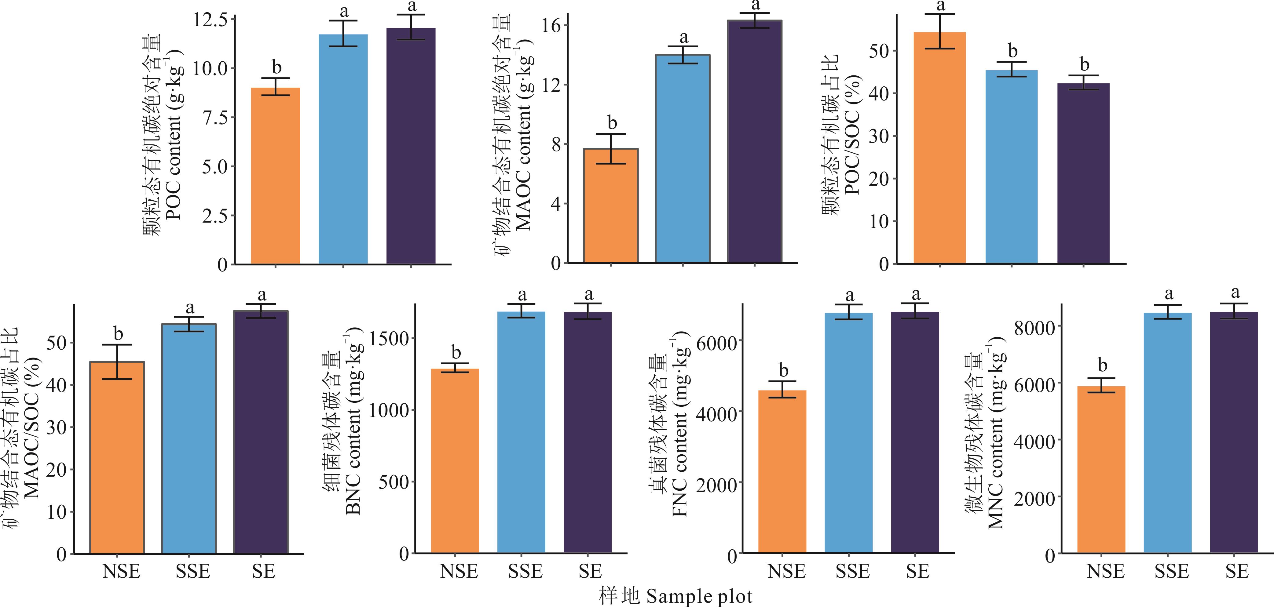 图1 灌丛化对土壤有机碳组分与相对占比及微生物残体碳的影响POC: Particulate organic carbon; MAOC: Mineral associated organic carbon; BNC: Bacterial necromass carbon; FNC: Fungal necromass carbon; MNC: Microbial necromass carbon; 误差棒代表均值±标准误Error bars represent means±standard errors. 下同The same below.