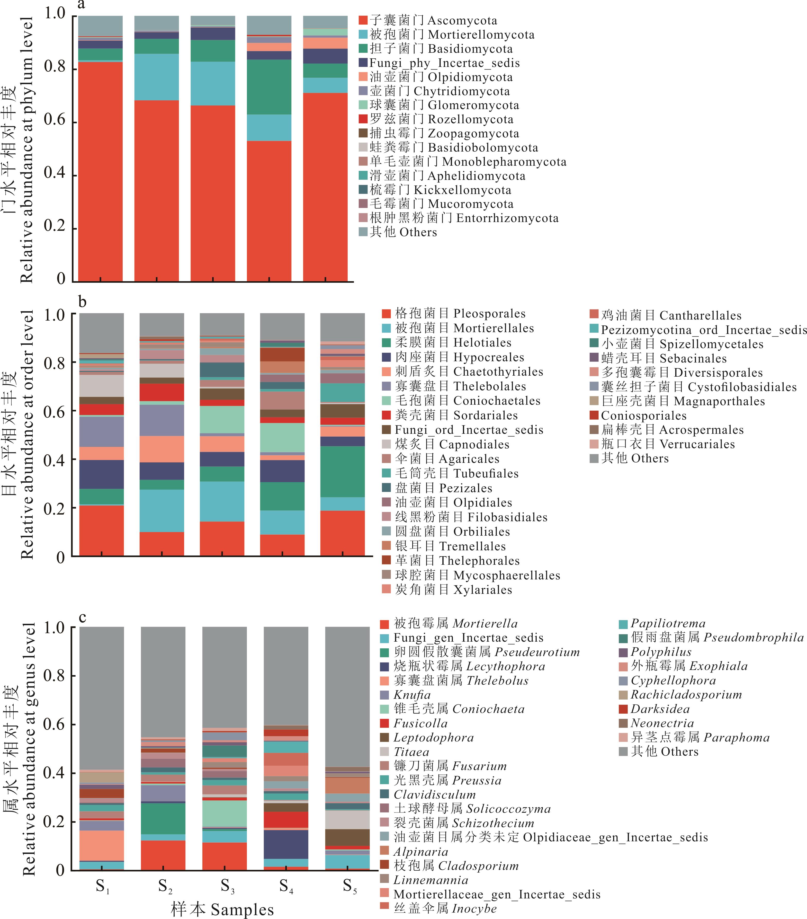 Fig.4 Abundance distribution of rhizosphere soil fungal community at phylum, order and genus levels under different altitudes