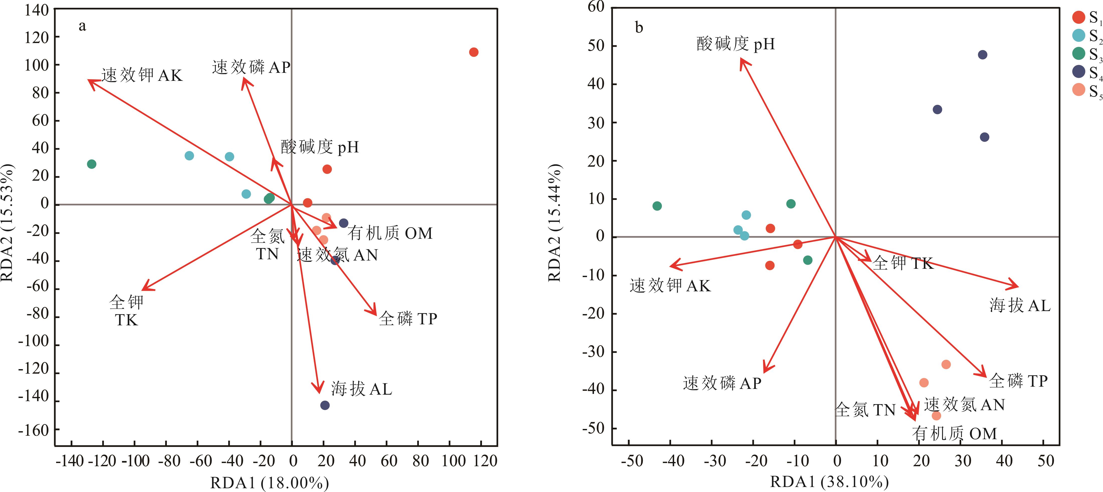 图7 不同海拔下根际土壤环境因子在属水平上的冗余分析A: 真菌Fungi; b: 细菌Bacteria.