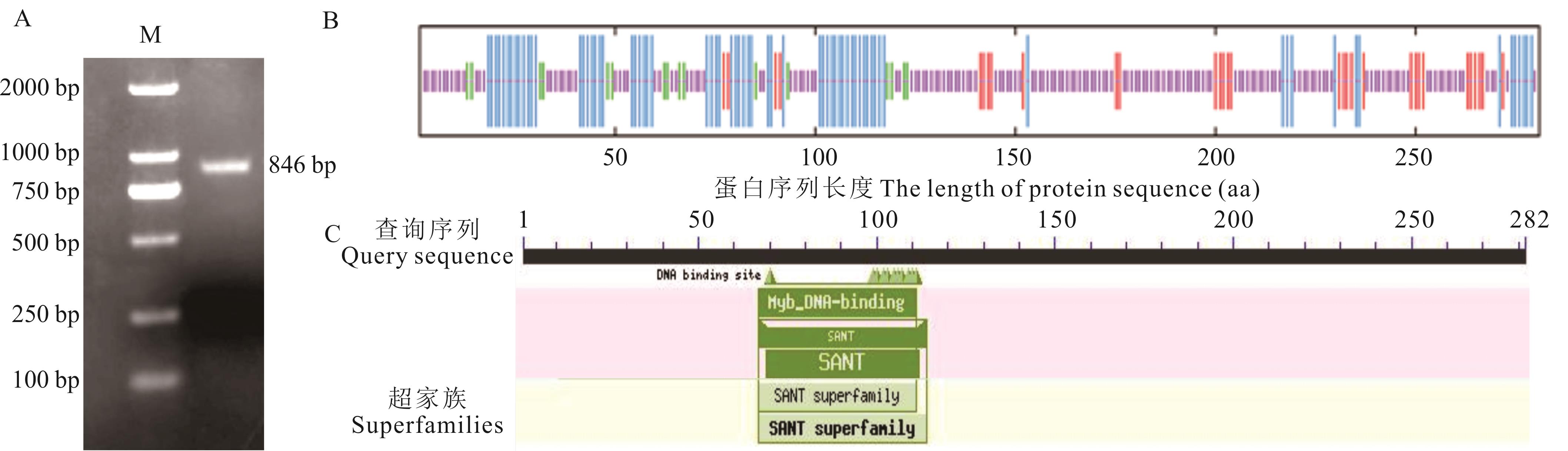 图2 CiMYB4的生物信息学分析A: CiMYB4的克隆Cloning of CiMYB4; B: CiMYB4蛋白的二级结构预测Prediction of CiMYB4 protein secondary structure. 紫色Purple: 无规则卷曲Random coil, 蓝色Blue: α螺旋α-helix, 绿色Green: β转角β-turn, 红色Red: 延伸链Extended strand; C: CiMYB4蛋白的保守结构域Conserved domain of CiMYB4.