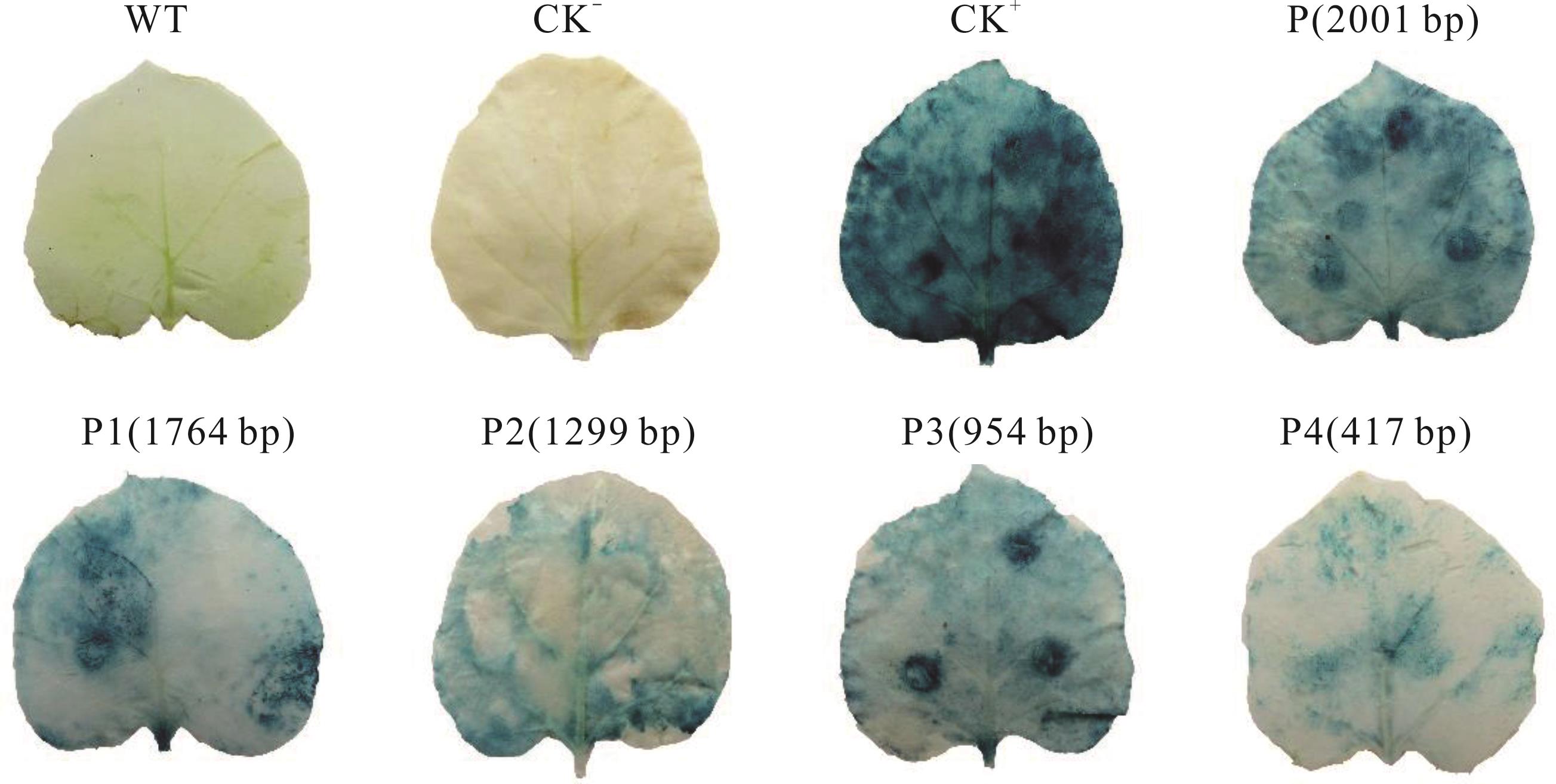 图5 CiMYB4启动子β-葡萄糖苷酸酶活性分析WT: 野生型Wild type; CK-: 阴性对照(仅注射缓冲液) Negative control (only buffer solution); CK+: 阳性对照(pBI121-GUS空载) Positive control (pBI121-GUS);P, P1, P2, P3, P4: 启动子5′端不同长度缺失片段Different length deletion fragments of promoter 5′ end.
