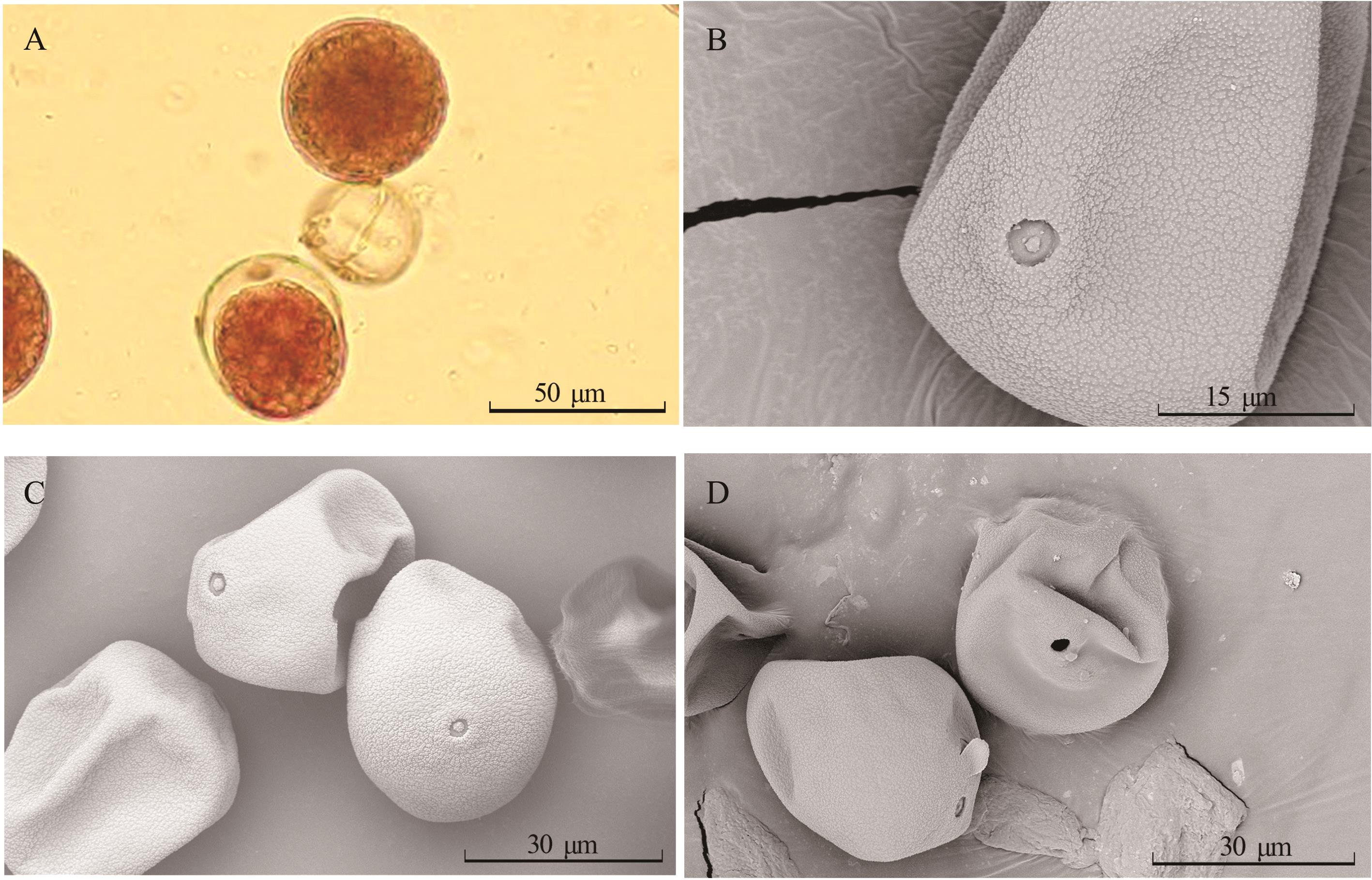 图2 ‘丽秋’狼尾草花粉形态观察A: 光学显微镜下花粉形态特征Pollen was observed under orthostatic optical microscope; B: 扫描电镜下花粉形态观察Pollen was observed under scanning electron microscope (SEM); C: 未经过花粉开孔液处理的花粉孔状态Pollen pore status that has not been treated with pollen pore-opening solution; D: 经过花粉开孔液处理的花粉孔状态Pollen pore status that has been treated with pollen pore-opening solution.