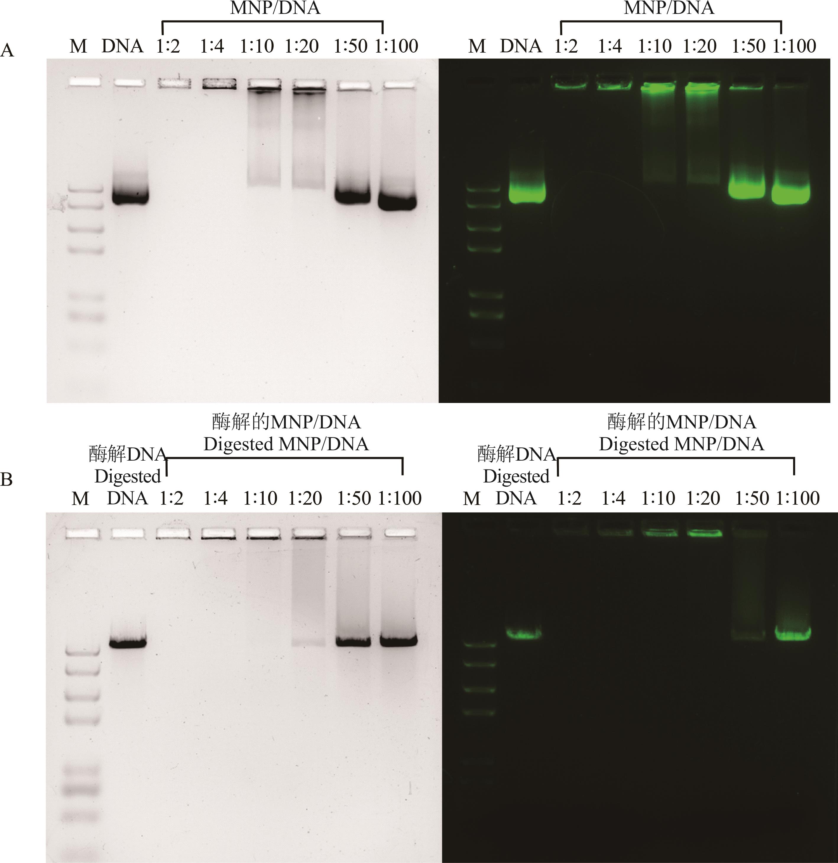 图3 纳米磁珠对质粒DNA的负载和保护能力A: MNP/DNA 复合物的琼脂糖凝胶电泳分析Agarose gel electrophoresis of plasmid DNA and MNPs/DNA; B: MNP/ DNA 复合物酶切产物的琼脂糖凝胶电泳分析Agarose gel electrophoresis of plasmid DNA and MNPs/DNA complexes digested with Xho Ⅰ; M: Trans 15K DNA Marker.