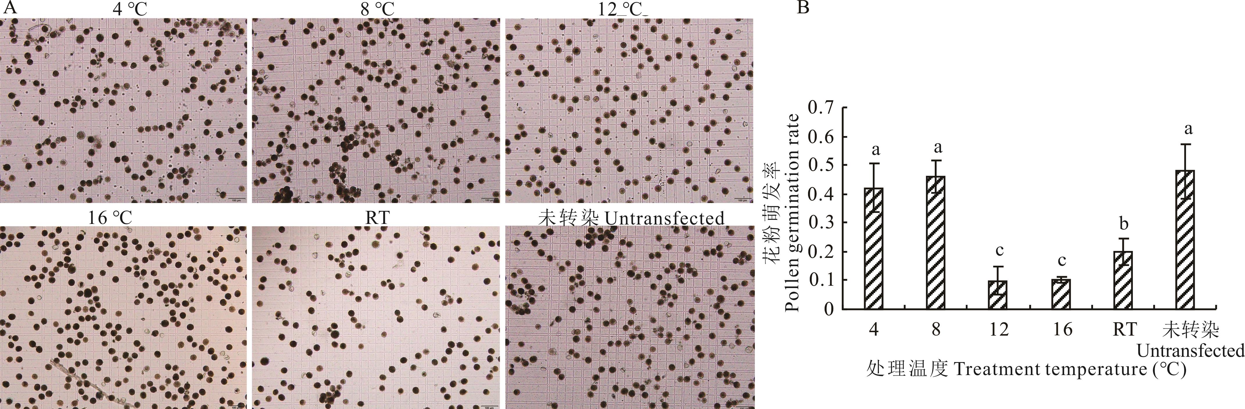 图4 ‘丽秋’狼尾草转染的最适温度A: 转染缓冲液预处理后,将花粉粒转入发芽液中,在室温下培养3 h After pretreatment with transfection buffer, pollen grains were transferred into germinating media and incubated 3 h under RT (直立光学显微镜下观察花粉萌发情况Pollen germination was observed under orthostatic optical microscope); B: 未经预处理或在指定温度下预处理的花粉发芽情况Germination of pollen without pretreatment with transfection or pretreated under indicated temperatures; RT: 室温Room temperature; 不同小写字母表示在P<0.05水平上差异显著,下同Different lowercase letters indicate significant differences at P<0.05 level, the same below.