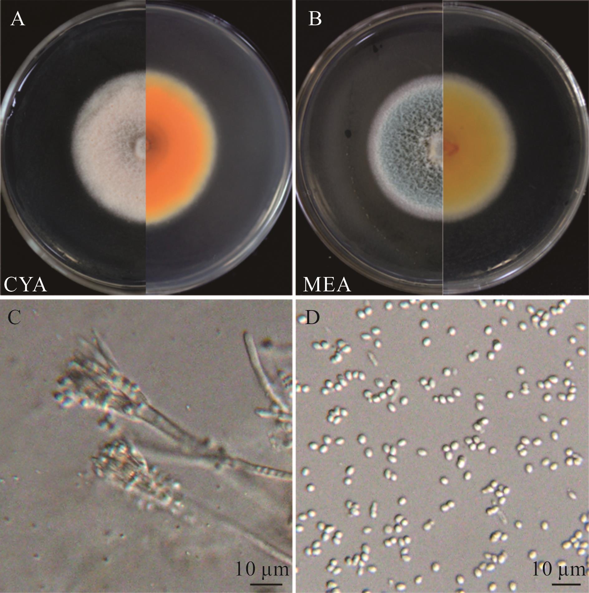 图1 菌株LMNS-G1P1的菌落形态(A、B)、分生孢子梗(C)和分生孢子(D)CYA: 察氏酵母膏琼脂培养基Czapek yeast autolysate agar; MEA: 麦芽浸粉琼脂培养基Malt extract agar medium. 下同The same below.
