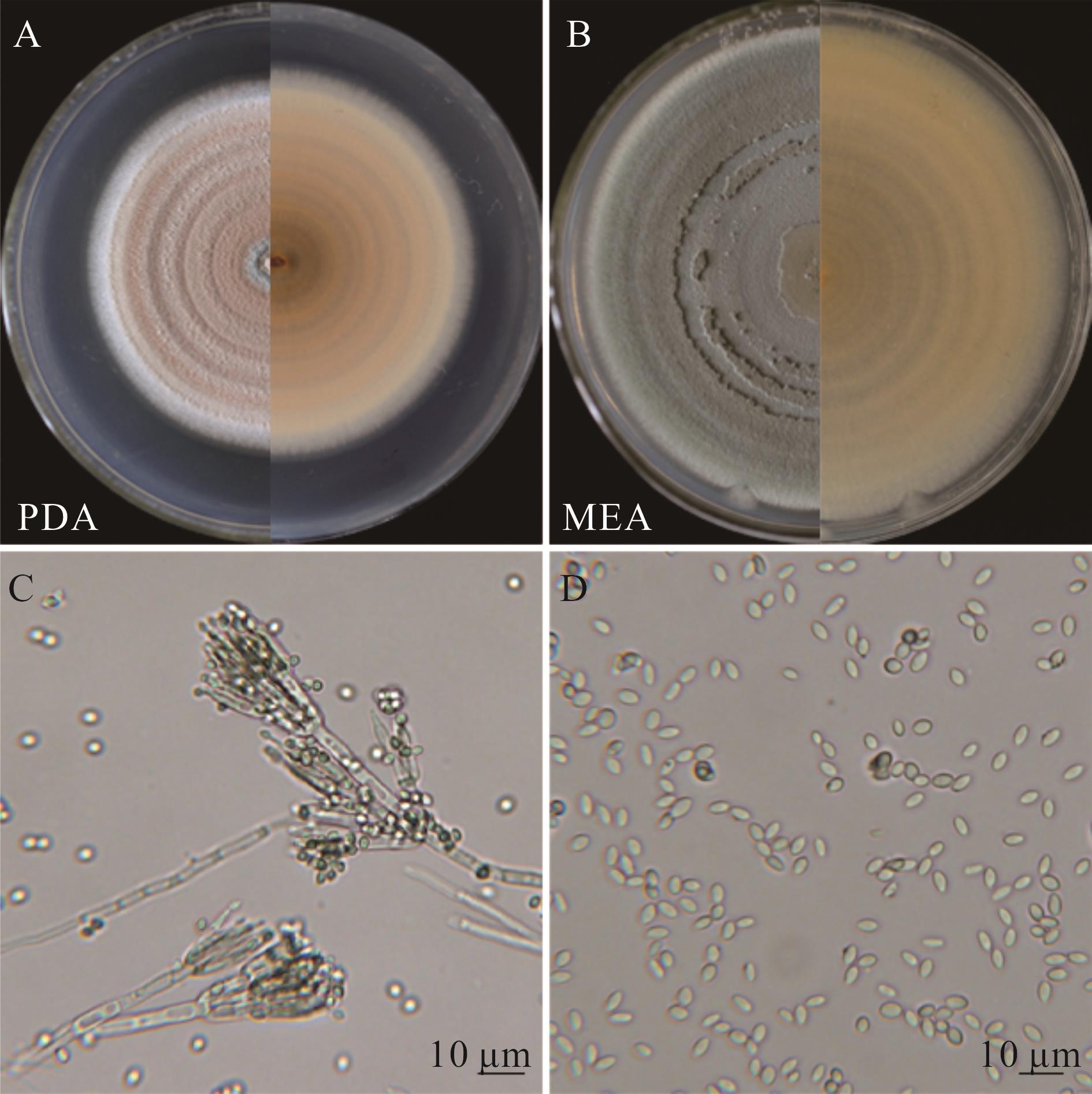 图3 菌株LMNS-K3R2的菌落形态(A、B)、分生孢子梗(C)和分生孢子(D)PDA: 马铃薯葡萄糖琼脂培养基Potato dextrose agar. 下同The same below.