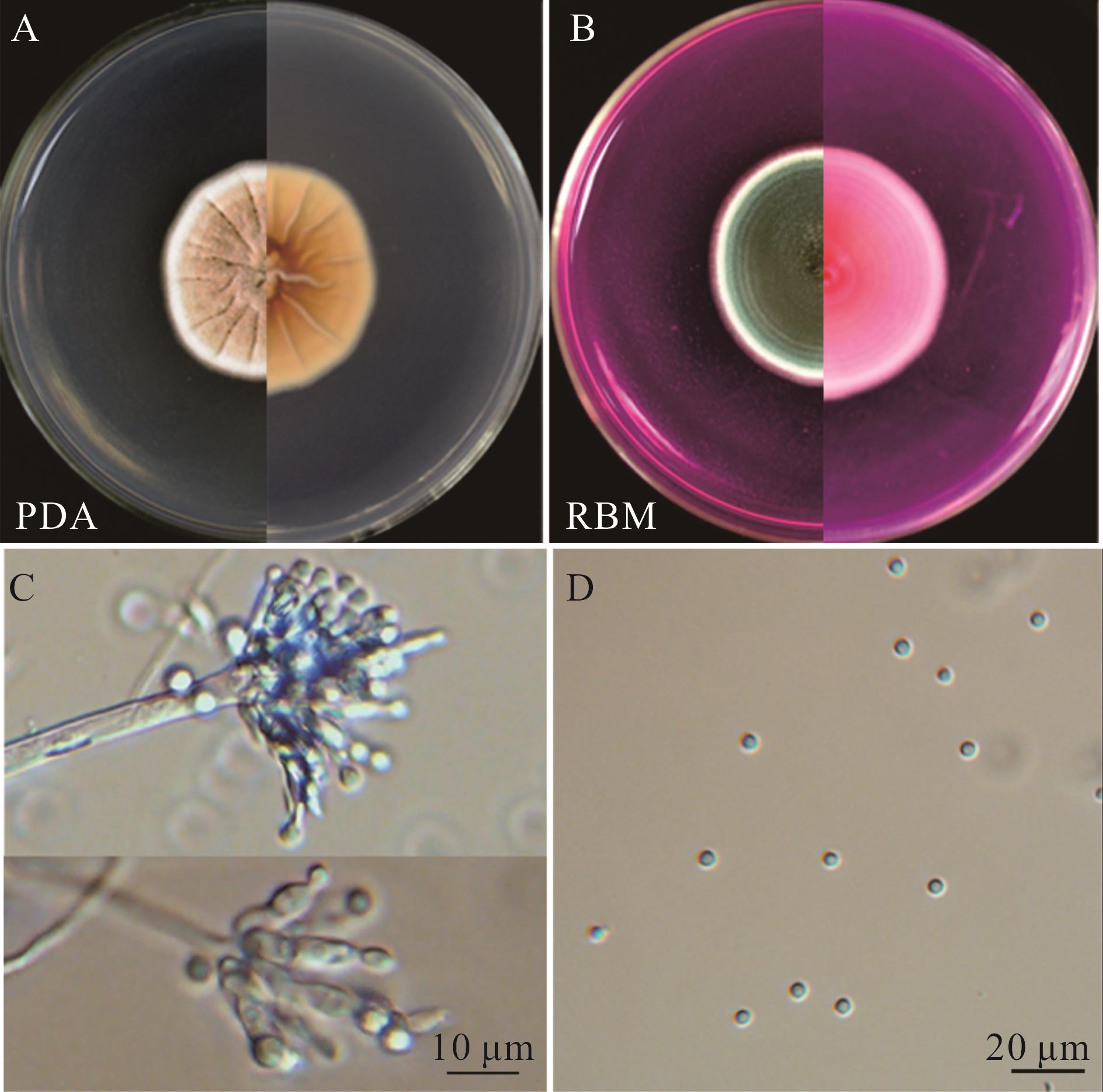 图6 菌株LMNS-K2R1的菌落形态(A、B)、分生孢子梗(C)和分生孢子(D)RBM: 孟加拉红培养基Rose bengal medium.