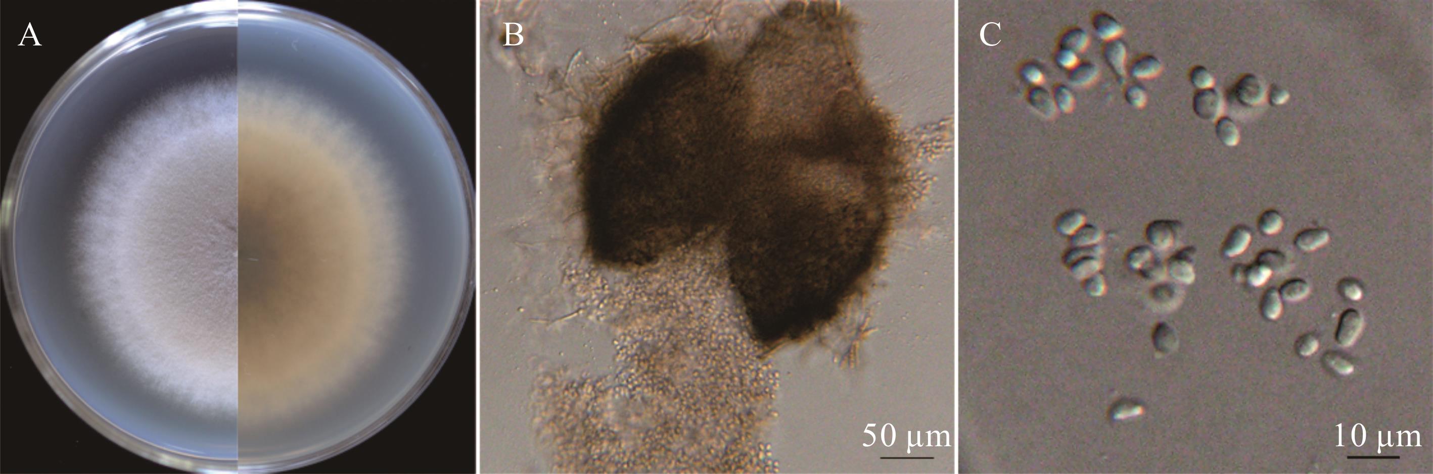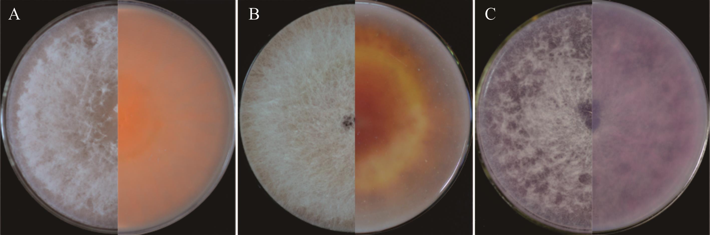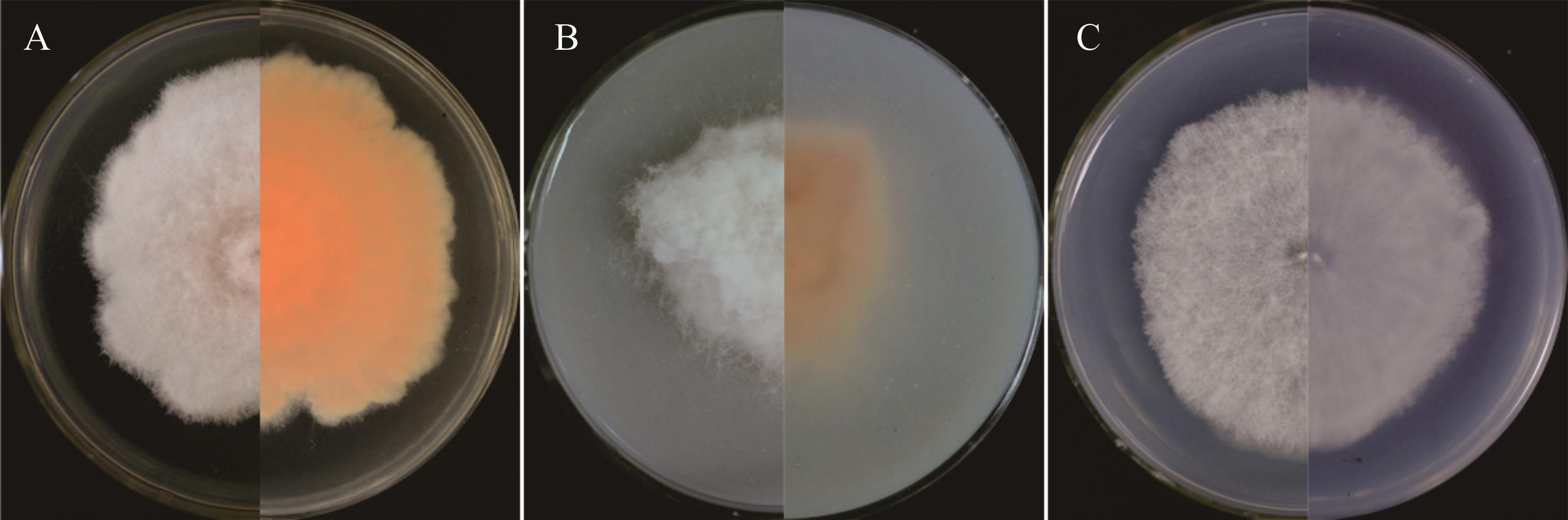图5 基于单基因构建的系统发育树A: 菌株LMNS-K3D1和LMNS-K2R1基于CaM序列构建的系统发育树Phylogenetic tree constructed for strains LMNS-K3D1 and LMNS-K2R1 based on the CaM sequence; B: 菌株LMNS-G2P3和LMNS-K3P1基于tef1序列构建的系统发育树Phylogenetic tree constructed for strains LMNS-G2P3 and LMNS-K3P1 based on the tef1 sequence; C: 菌株LMNS-C3M2和LMNS-C1R3基于ITS序列构建的系统发育树Phylogenetic tree constructed for strains LMNS-C3M2 and LMNS-C1R3 based on the ITS sequence.