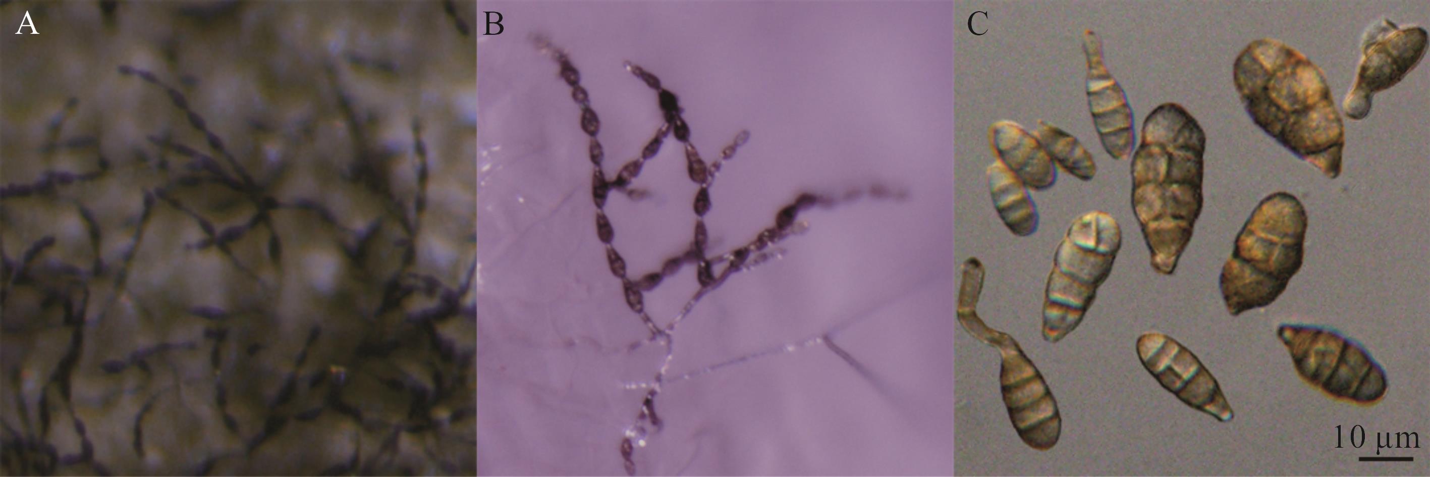 图2 基于多基因构建的系统发育树A: 菌株LMNS-G1P1和LMNS-K3R2基于CaM和ITS序列构建的系统发育树Phylogenetic tree constructed for strains LMNS-G1P1 and LMNS-K3R2 based on CaM and ITS sequences; B: 菌株LMNS-G2M1、LMNS-G4M4和LMNS-C1M1基于Alt a 1、endoPG和OPA10-2序列构建的系统发育树Phylogenetic tree constructed for strains LMNS-G2M1, LMNS-G4M4, and LMNS-C1M1 based on Alt a 1, endoPG, and OPA10-2 sequences.