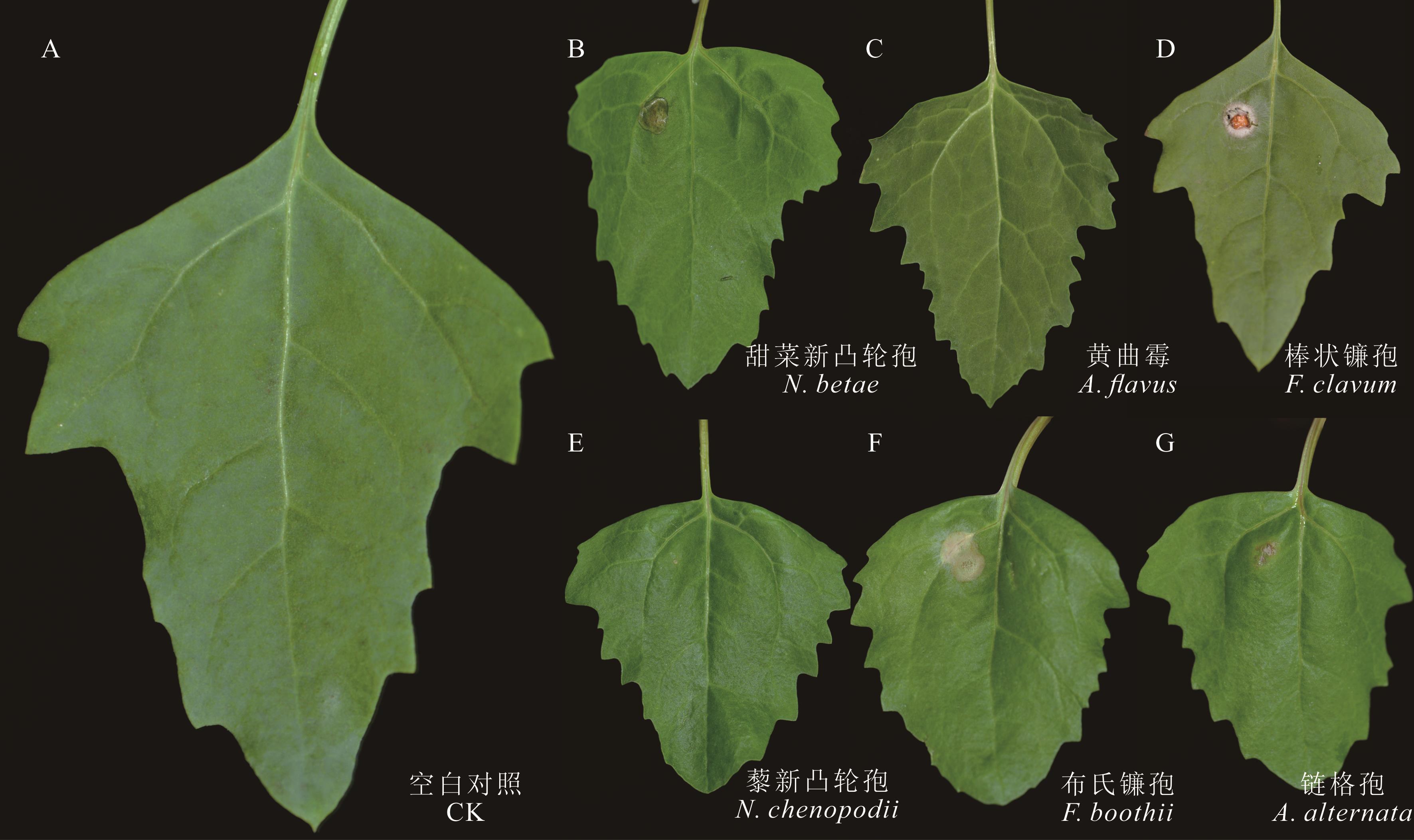 图13 藜麦叶片接种6种内生真菌后的症状A: 对照组未接种病原; B: 接种N. betae 1 d; C: 接种A. flavus 3 d; D: 接种F. clavum 2 d; E: 接种N. chenopodii 2 d; F: 接种F. boothii 3 d; G: 接种A. alternata 3 d。A: The control group was not inoculated with pathogens; B: Symptoms of quinoa leaves inoculated with N. betae for 1 d; C: Symptoms of quinoa leaves inoculated with A. flavus for 3 d; D: Symptoms of quinoa leaves inoculated with F. clavum for 2 d; E: Symptoms of quinoa leaves inoculated with N. chenopodii for 2 d; F: Symptoms of quinoa leaves inoculated with F. boothii for 3 d; G: Symptoms of quinoa leaves inoculated with A. alternata for 3 d.