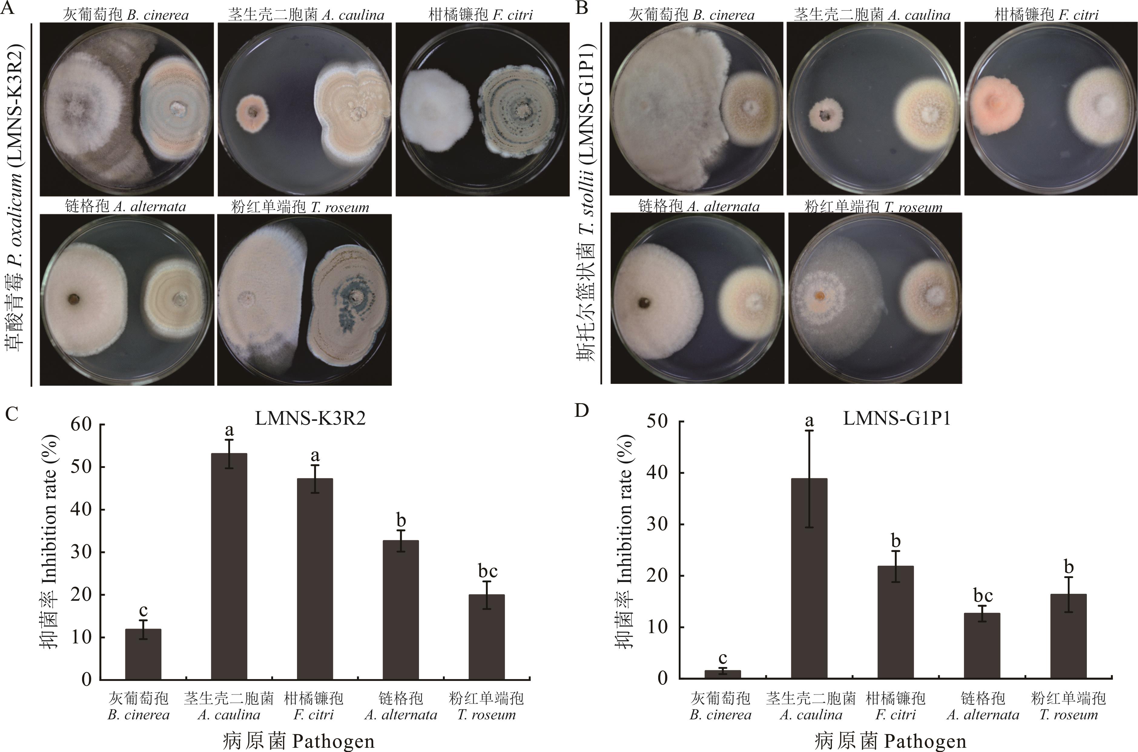 图14 藜麦种子内生真菌对5种病原菌的抑制作用不同小写字母表示在P<0.05水平差异显著。Different lowercase letters indicate significant difference in P<0.05 level.