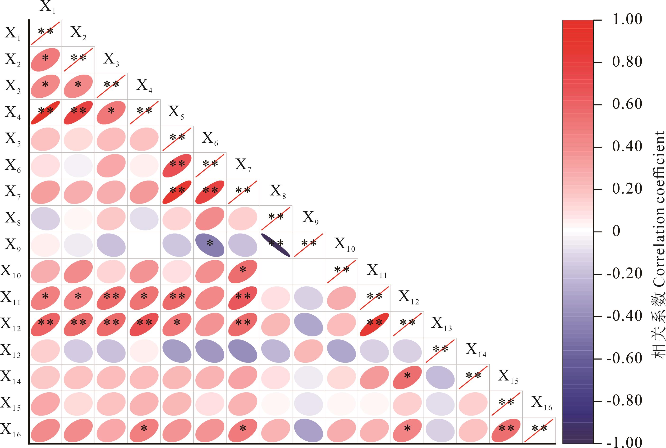 图6 猫尾草种质光合特性各指标间相关性分析**: P<0.01; *: P<0.05. X1: 叶绿素a含量Chl a content; X2: 叶绿素b含量Chl b content; X3: 类胡萝卜素含量Car content; X4: 总叶绿素含量TChl content; X5: 蒸腾速率Tr; X6: 气孔导度Gs; X7: 净光合速率Pn; X8; 胞间二氧化碳浓度Ci; X9: 气孔限制值Ls; X10: 水分利用效率WUE; X11: PSⅡ最大光合效率Fv/Fm; X12: PSⅡ潜在光化学效率Fv/Fo; X13: 非光化学淬灭系数qN; X14: 光化学淬灭系数qP; X15: 表观电子传递效率ETR; X16: PSⅡ光化学量子产量Yield. 下同The same below.