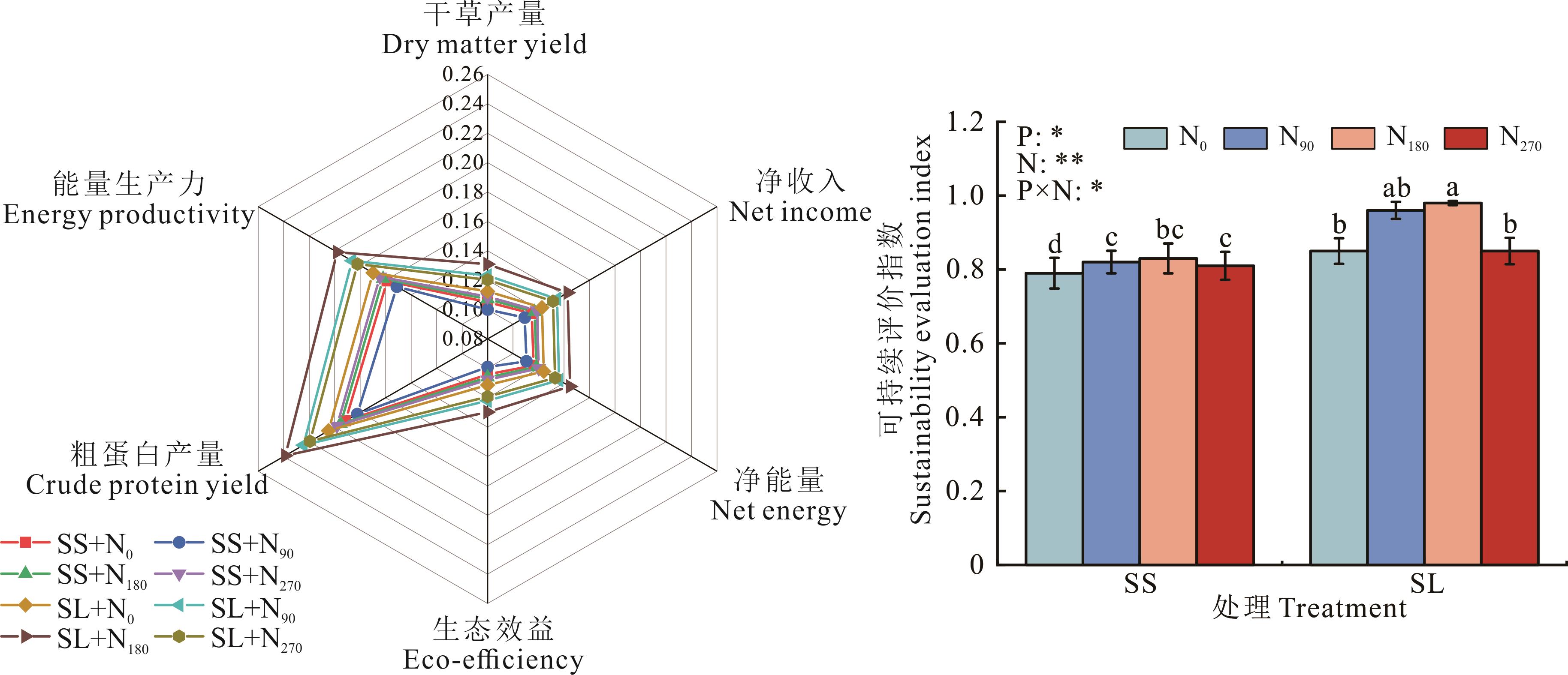 通过探讨混播模式下不同施氮水平对草地生产性能、经济效益、能量利用效率和生态效能指数的影响,可为氮素高效利用和生态可持续发展提供科学依据。于2021-2023年在宁夏大学四墩子草学野外科学研究基地开展田间定位试验,采用双因素试验设计,设置2个种植模式(SS:饲用高粱单播;SL:饲用高粱/拉巴豆混播)和4个施氮水平(N0:0 kg·hm-2;N90:90 kg·hm-2;N180:180 kg·hm-2;N270:270 kg·hm-2)。结果表明:混播与氮素调控的协同效应显著提高了系统干草产量和粗蛋白产量,且在施氮量为180 kg·hm-2水平下表现出最优生产性能,干草产量(29.08 t·hm-2)和粗蛋白产量(2.62 t·hm-2)均达到最高,较饲用高粱单播模式平均提高了20.69%~23.86%和21.03%~26.89%。经济效益分析显示,在180 kg·hm-2施氮水平下饲用高粱/拉巴豆混播模式的年均净收入和净产出能量均为最高,较不施肥分别提高33.94%和21.32%,表现出良好的经济-能源协同效应。此外,饲用高粱/拉巴豆混播模式下施氮量为90 kg·hm-2时能量利用效率和能量生产力最高,分别为10.84和0.60 kg·MJ-1,较不施肥分别提高了1.94%和1.95%。综合草地生产性能、经济效益、能量利用效率以及生态效能指数对不同种植模式进行可持续评价得出,混播结合施氮180 kg·hm-2处理下可持续指数最高(0.97)。因此,西北干旱区饲用高粱/拉巴豆混播种植系统的最佳施氮量为180 kg·hm-2,以相对较低的氮肥投入提高了牧草产量和农业系统的可持续性。