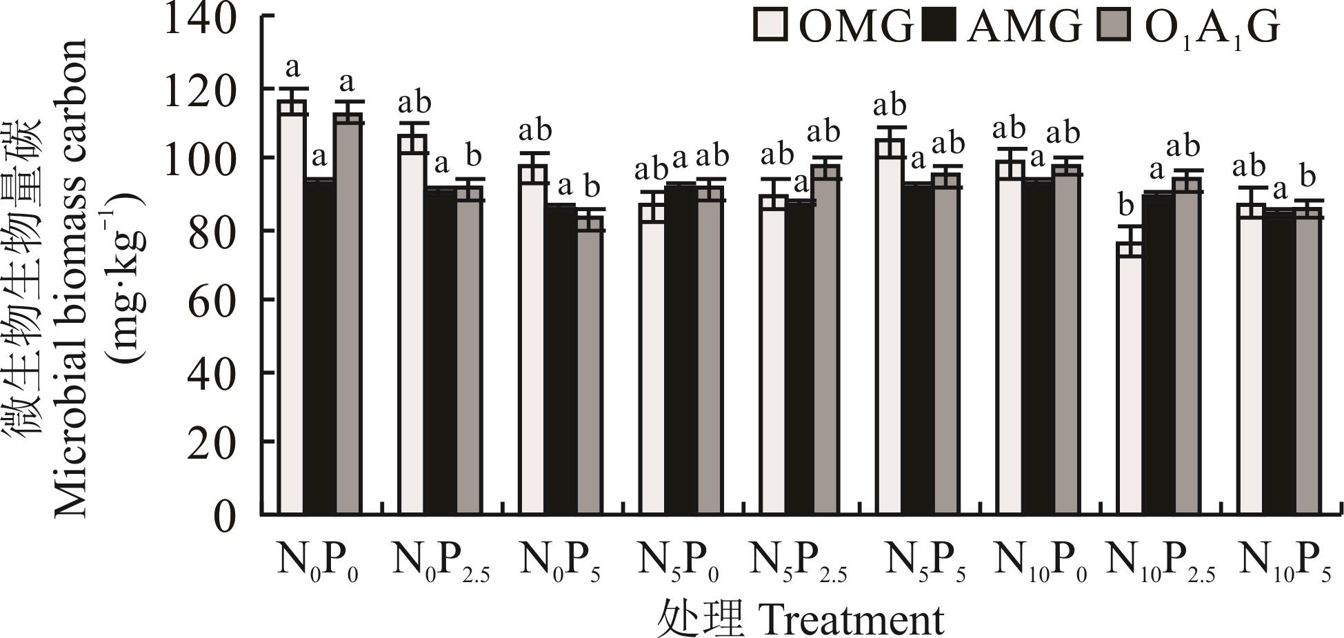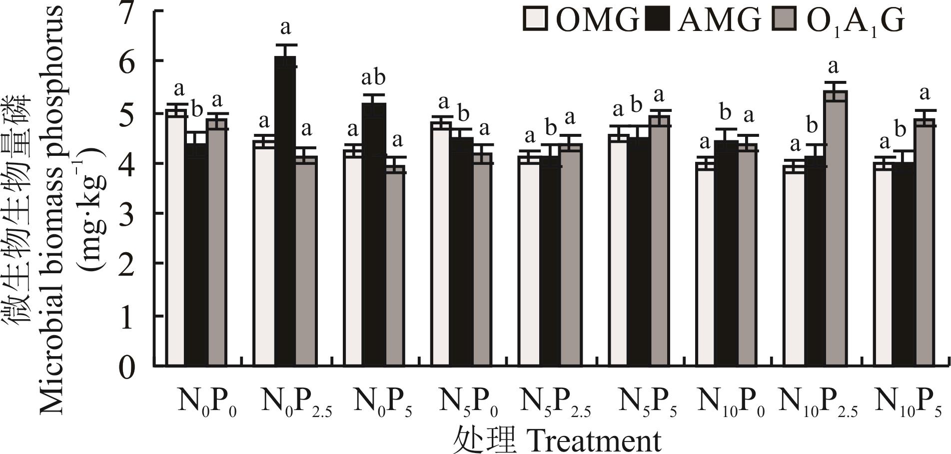 图1 不同氮磷添加水平下土壤微生物生物量碳含量OMG: 燕麦单播草地Oat monoculture grassland; AMG: 苜蓿单播草地Alfalfa monoculture grassland; O1A1G: 燕麦×苜蓿(1∶1)混播草地Oat×alfalfa mixed grassland (1∶1). 同一播种方式下不同字母表示差异显著(P<0.05),下同。Different letters of the same sowing method indicated significant difference (P<0.05), the same below.