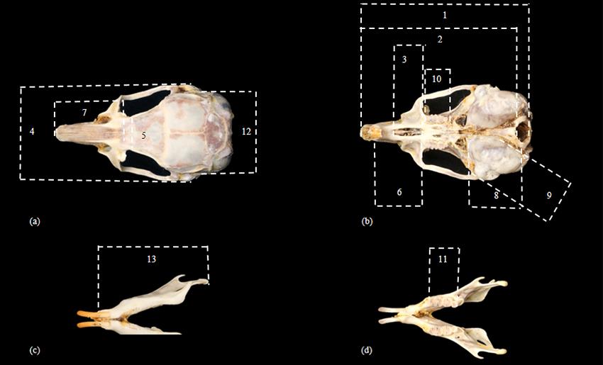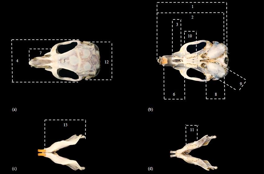 图4 大沙鼠头骨测量指标(a)大沙鼠颅骨背面观 Dorsal view of the skull of R. opimus;(b)大沙鼠颅骨腹面观 Ventral view of the skull of R. opimus;(c)大沙鼠下颌骨内侧面观 Internal view of R. opimus mandible; (d)大沙鼠下颌骨外侧面观 External view of R. opimus mandible. 1.颅全长 Profile length; 2.基长 Basal length; 3.腭长 Median palatal length; 4.颧宽 Zygomatic breadth; 5.眶间宽 Least breadth between the orbits; 6.齿隙长 Diastema length; 7.鼻骨长 Greatest length of the nasals; 8.听泡长 Length of tympanic bulla; 9.听泡宽 Width of tympanic bulla; 10.上齿列长 Length of the up tooth row; 11.下齿列长 Length of the down tooth row; 12.后头宽 Greatest mastoid breadth; 13.下颌长 Lower jaw length.