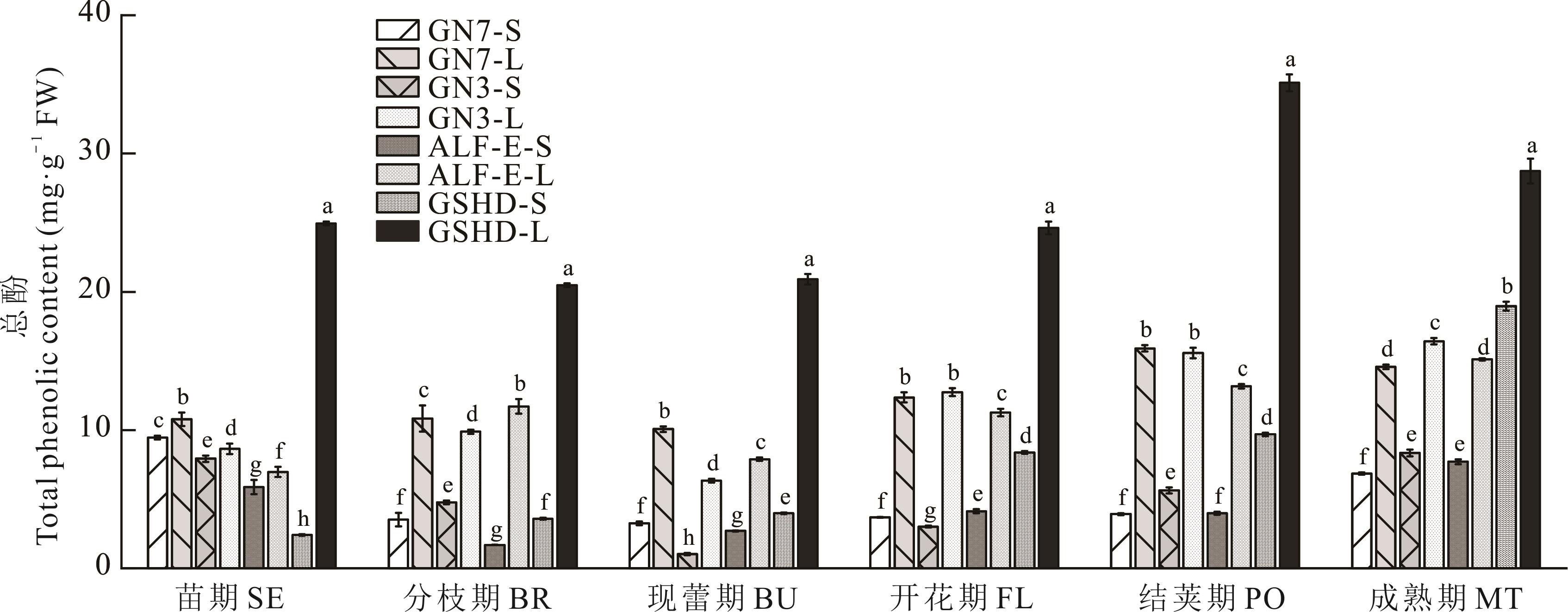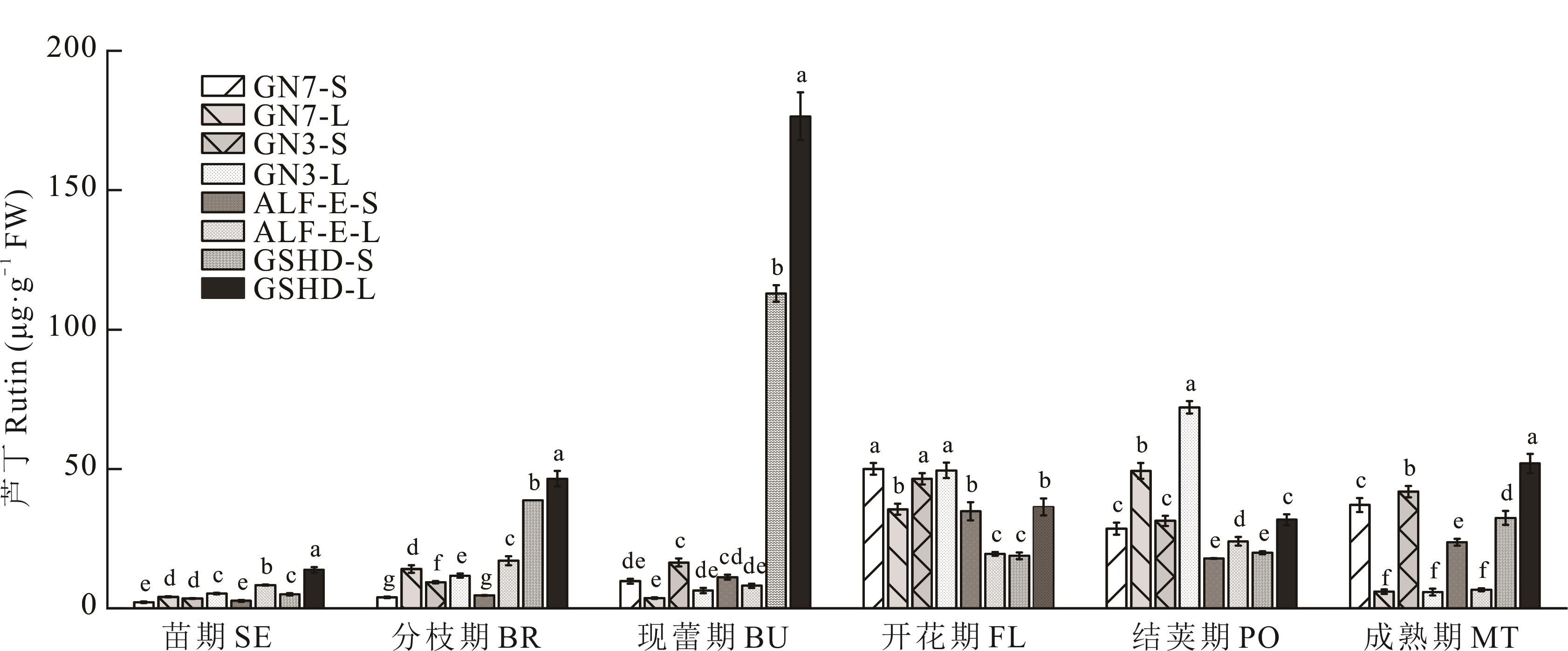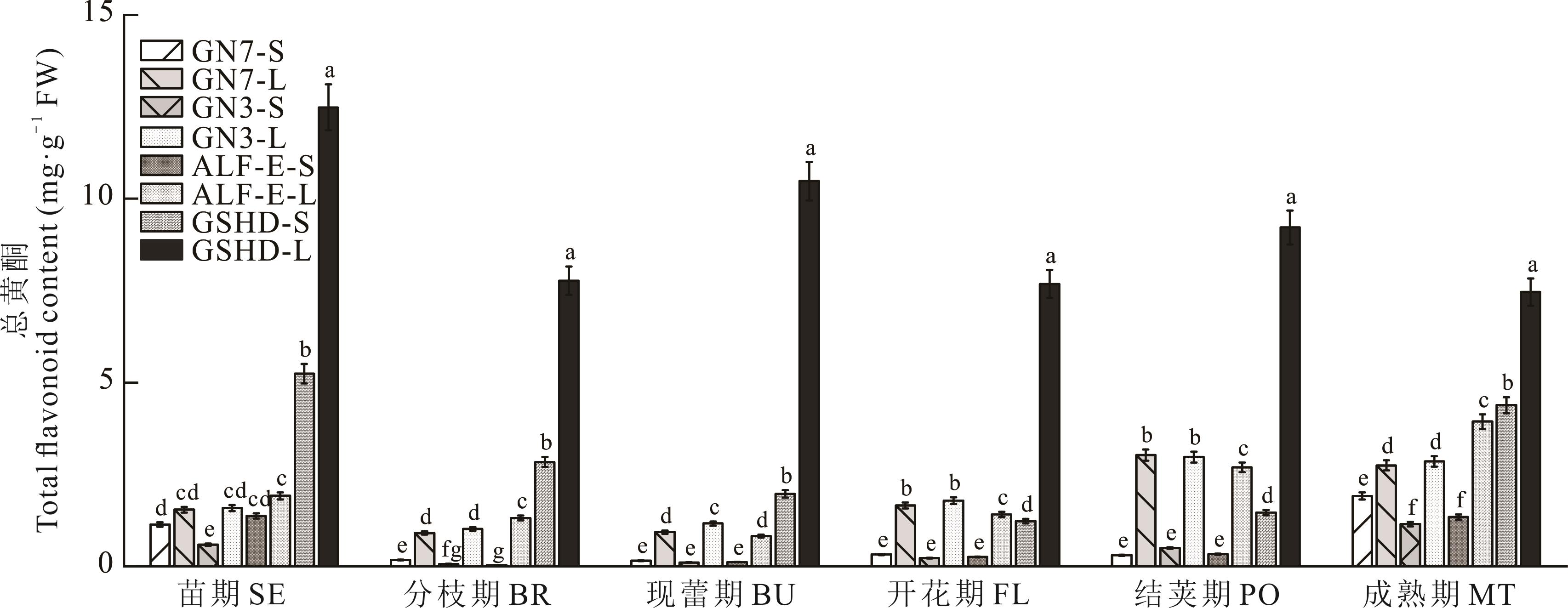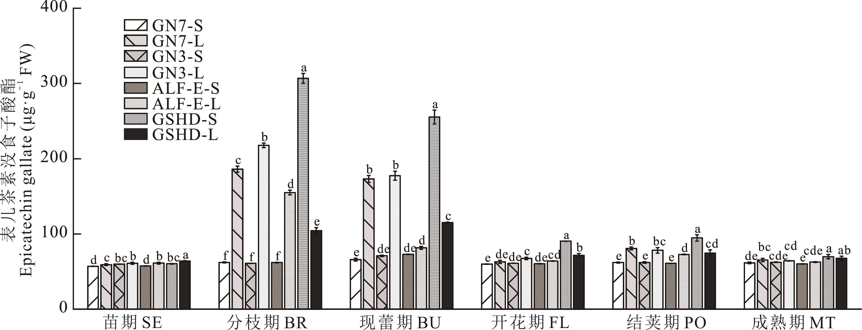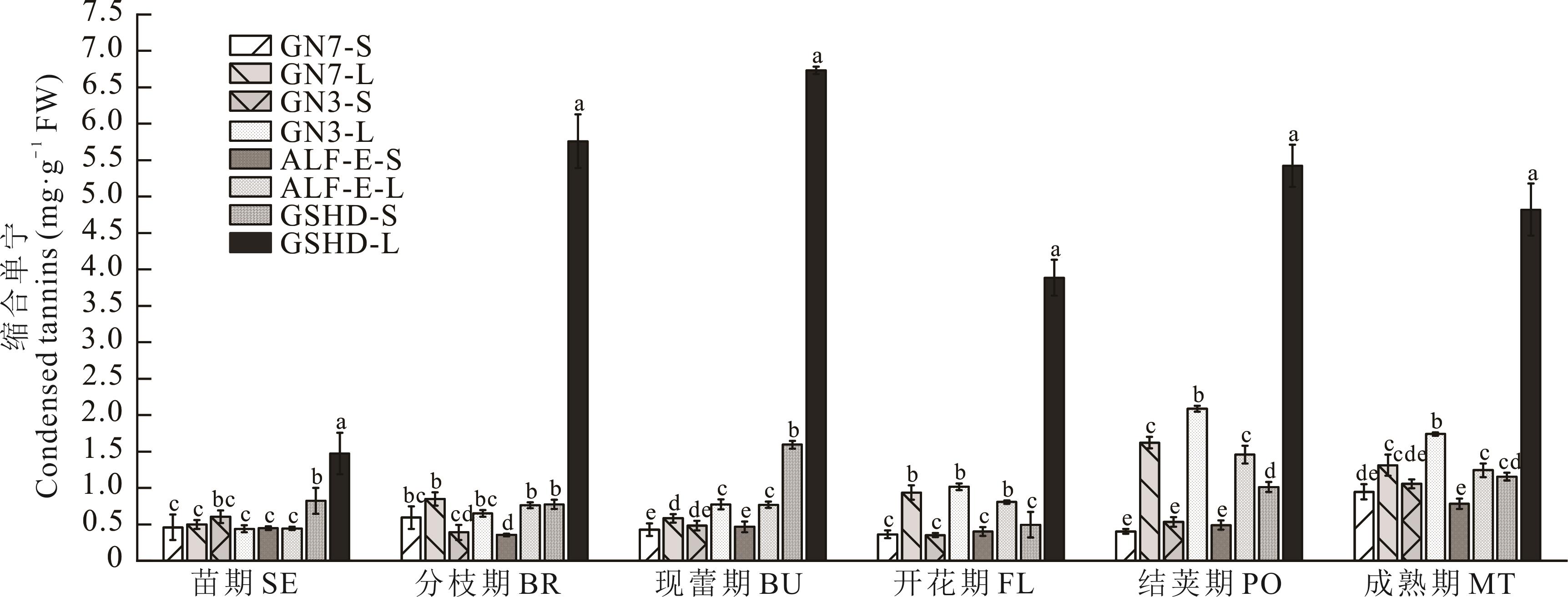 本研究以‘甘农3号’、‘甘农7号’、‘精英’紫花苜蓿及‘甘肃’红豆草为材料,分析苗期至成熟期6个生长期茎、叶部位总酚、总黄酮、缩合单宁(CT)及次生代谢产物(芦丁、没食子酸、表儿茶素没食子酸酯、表儿茶素、儿茶素)动态积累规律,并测定苯丙烷代谢途径关键酶[苯丙氨酸解氨酶(PAL)、4-香豆酸-CoA连接酶(4CL)、肉桂酸-4-羟化酶(C4H)]和类黄酮途径[花青素还原酶(ANR)、无色花色素还原酶(LAR)]活性,以解析缩合单宁合成调控机制。结果表明:1)缩合单宁含量随生育期推进呈显著变化,‘甘肃’红豆草现蕾期、紫花苜蓿结荚期为累积高峰期,且叶部含量普遍高于茎部;2)总黄酮与芦丁含量变化趋势与缩合单宁相似;3)4CL、ANR、PAL、LAR和C4H活性在‘甘肃’红豆草现蕾期、紫花苜蓿结荚期显著升高,表明苯丙烷代谢向缩合单宁合成方向增强。品种间比较显示,‘甘农3号’紫花苜蓿缩合单宁含量在结荚期显著高于其他品种(P<0.05),表示其具有更强单宁合成潜力。本研究明确了 CT 合成关键酶与代谢产物的动态关联,为牧草 CT 代谢调控及高单宁品种选育提供理论依据。