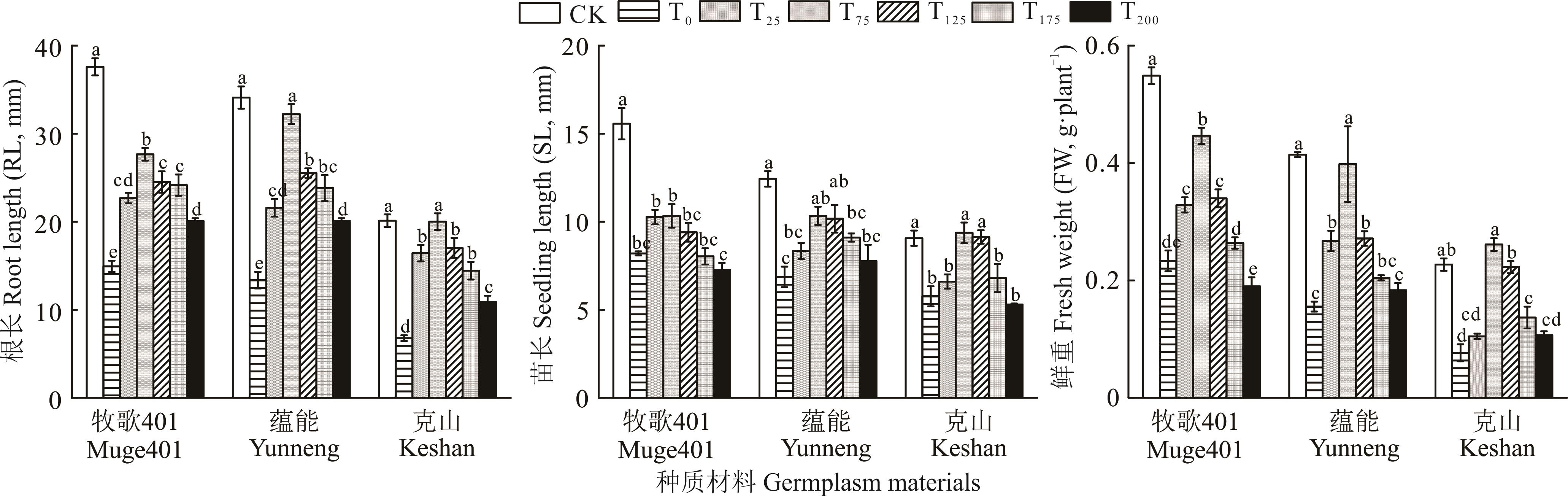 图2 壳聚糖浸种处理对盐碱胁迫下紫花苜蓿种子发芽率和发芽势的影响CK、T0、T25、T75、T125、T175和T200分别代表7个处理水平,分别为蒸馏水处理、盐碱胁迫下0、25、75、125、175和200 mg·L-1壳聚糖浸种处理;不同小写字母表示同一种质材料不同处理水平间差异显著(P<0.05),下同。CK, T0, T25, T75, T125, T175 and T200 represent 7 treatment levels respectively, which are distilled water treatment 0, 25, 75, 125, 175 and 200 mg·L-1 chitosan soaking treatment under saline-alkaline stress. Different lowercase letters indicate significant differences among different treatment levels for the same germplasm material (P<0.05), the same below.