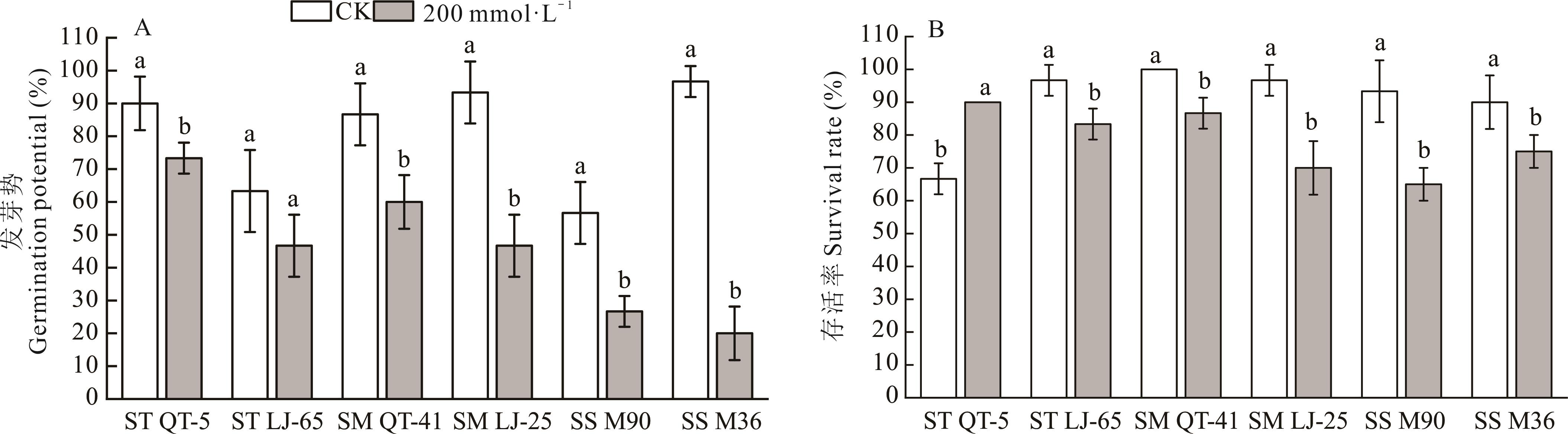 图2 不同耐盐性小黑麦种质资源萌发期指标的对比分析ST:耐盐型;SM:耐盐中间型;SS:盐敏感型;CK:对照组(蒸馏水处理);200 mmol·L-1:盐胁迫组(200 mmol·L-1 NaCl溶液处理)。不同小写字母表示同一品种不同处理间差异显著(P<0.05) ,下同。ST: Salt-tolerant type; SM: Salt-tolerant intermediate type; SS: Salt-sensitive type; CK: Control group (treated with distilled water); 200 mmol·L-1: Salt stress group (treated with 200 mmol·L-1 NaCl solution). Different lowercase letters indicate significant differences between different treatments within the same variety at P<0.05, the same below.