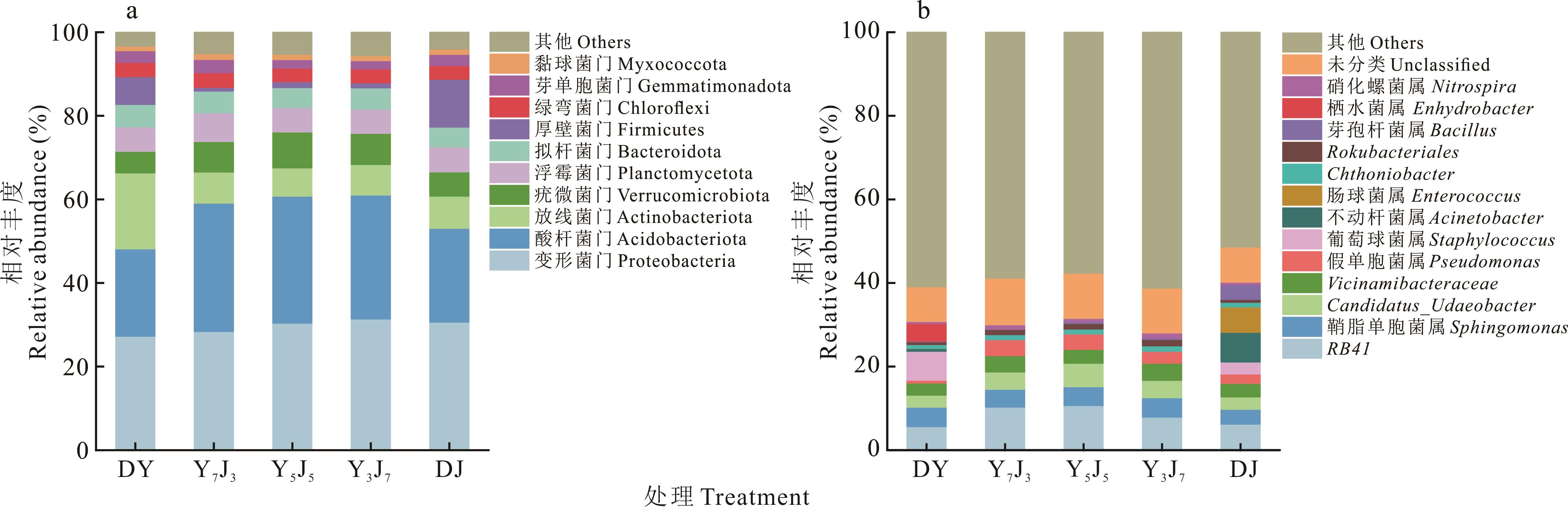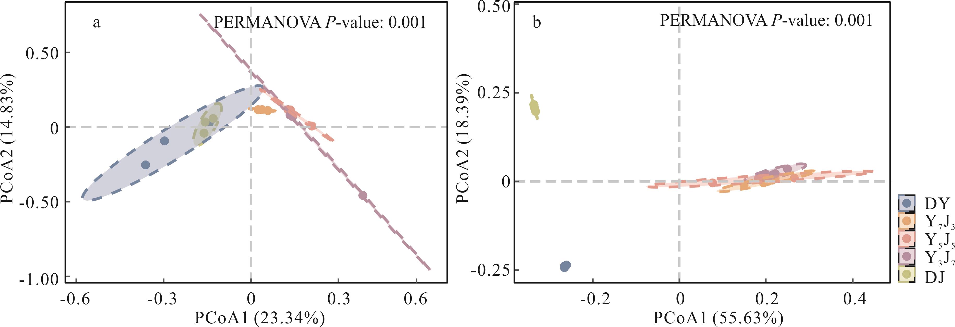 三江源区作为我国重要生态屏障,其土壤微生物多样性对维系生态系统稳定意义重大。为探究混播对根际土壤微生物群落的影响,本研究以燕麦与箭筈豌豆分别按7∶3(Y7J3)、5∶5(Y5J5)、3∶7(Y3J7)建植人工混播草地,以两种饲草单播作为对照,研究土壤养分、根际微生物群落结构及多样性的变化,并通过Mantel test解析二者关联。结果表明:混播显著提高土壤pH、有机质、全氮及有效磷含量(P<0.05),其中Y7J3处理的提升效果最为显著(P<0.05)。混播降低了土壤微生物群落的丰富度及多样性,细菌群落中酸杆菌门、RB41和假单胞菌属及真菌群落中子囊菌门、被孢霉门、寡囊盘菌属、外瓶霉属的相对丰度显著增加(P<0.05)。Mantel test分析表明,土壤pH、有机质、碱解氮及有效磷是调控土壤微生物群落的关键驱动因子(P<0.05)。综上所述,燕麦与箭筈豌豆混播通过改变三江源区根际土壤养分,显著影响土壤微生物群落结构与多样性,其中燕麦与箭筈豌豆以7∶3比例混播效果最优,土壤pH、有机质等关键因子在调控微生物群落过程中发挥核心作用。本研究结果为三江源区人工草地优化种植及改善土壤生态功能提供了重要的理论依据和实践指导。