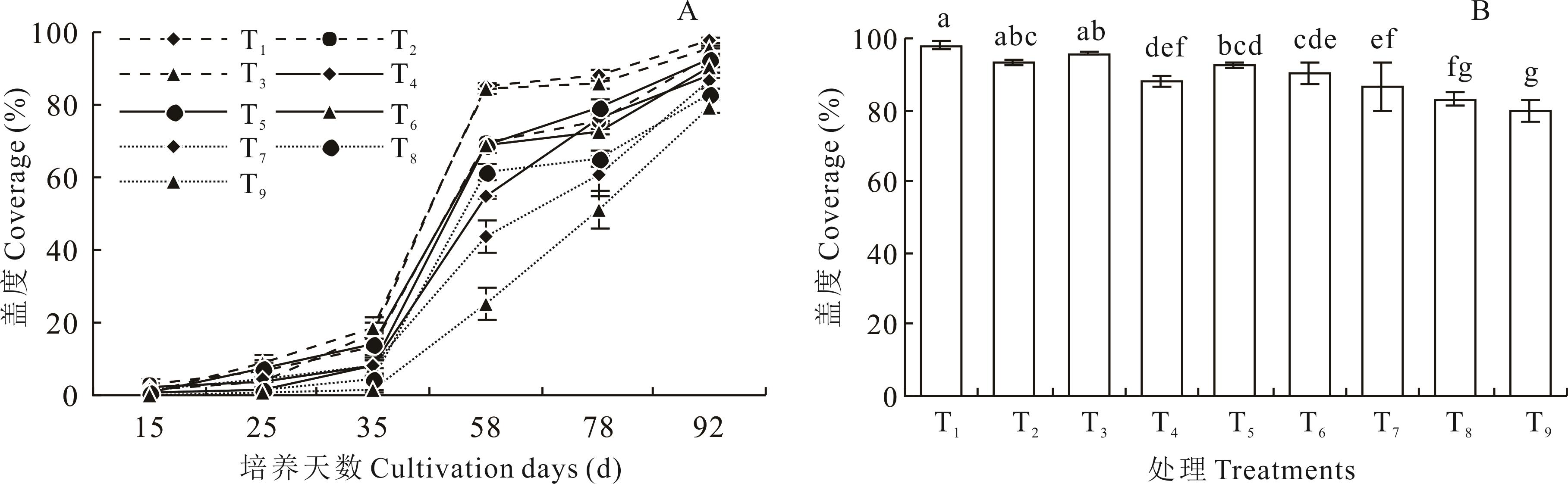 图1 正交试验不同培育天数苔藓结皮盖度动态变化(A)和培育末期苔藓结皮盖度(B)不同处理组分别表示Different treatments represent: T1 (C: 0 g·m-2; N: 0 g·m-2; P: 0 g·m-2; K: 0 g·m-2); T2 (C: 5 g·m-2; N: 0 g·m-2; P: 20 g·m-2; K: 10 g·m-2); T3 (C: 10 g·m-2; N: 0 g·m-2; P: 10 g·m-2; K: 20 g·m-2); T4 (C: 10 g·m-2; N: 10 g·m-2; P: 20 g·m-2; K: 0 g·m-2); T5 (C: 0 g·m-2; N: 10 g·m-2; P: 10 g·m-2; K: 20 g·m-2); T6 (C: 5 g·m-2; N: 10 g·m-2; P: 0 g·m-2; K: 20 g·m-2); T7 (C: 5 g·m-2; N: 20 g·m-2; P: 10 g·m-2; K: 0 g·m-2); T8 (C: 10 g·m-2; N: 20 g·m-2; P: 0 g·m-2; K: 10 g·m-2); T9 (C: 0 g·m-2; N: 20 g·m-2; P: 20 g·m-2; K: 20 g·m-2)。不同小写字母表示不同处理组间差异显著(P<0.05)。下同。Different lowercase letters indicated significant differences among different treatment groups (P<0.05). The same below.