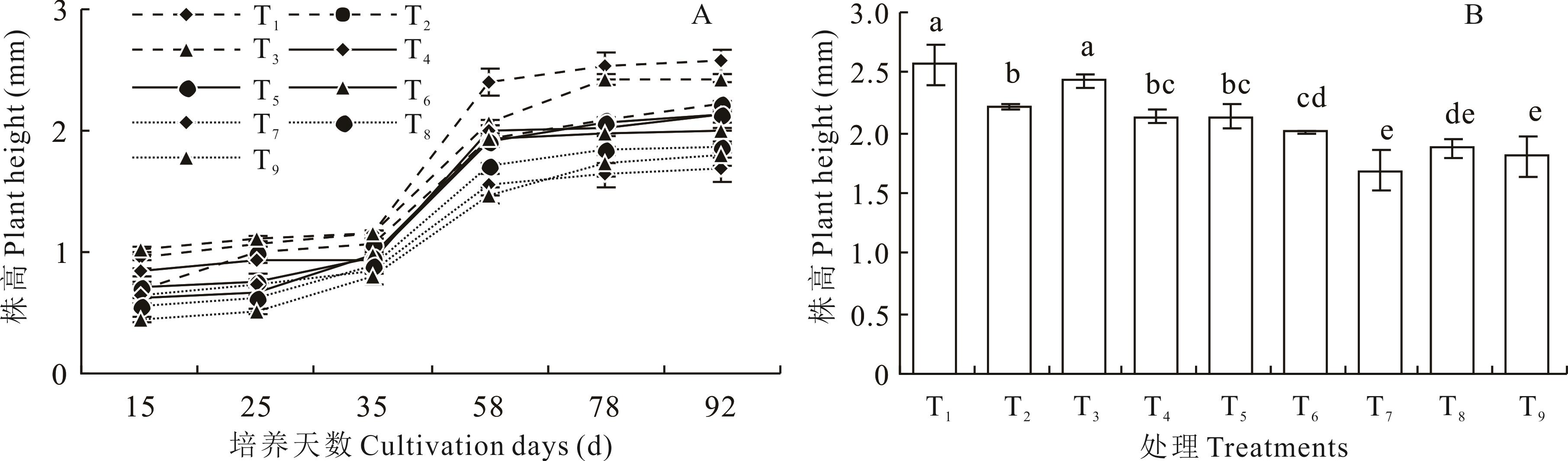 图6 完全组合试验不同培育天数苔藓植物株高动态变化(A)和培育末期苔藓植物株高(B)