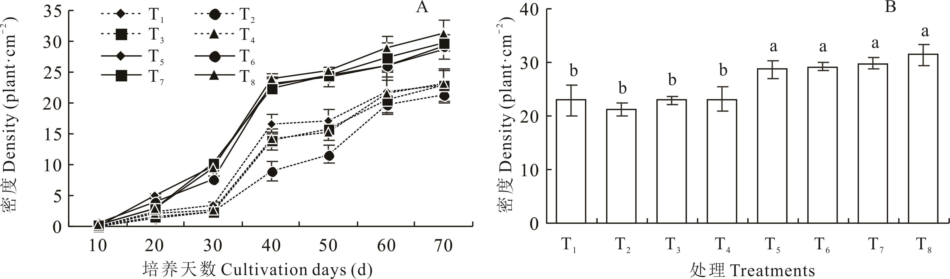 Fig.5 Dynamic changes of moss crust density in different cultivation days in complete combination experiment (A) and moss crust density at the end of cultivation (B)