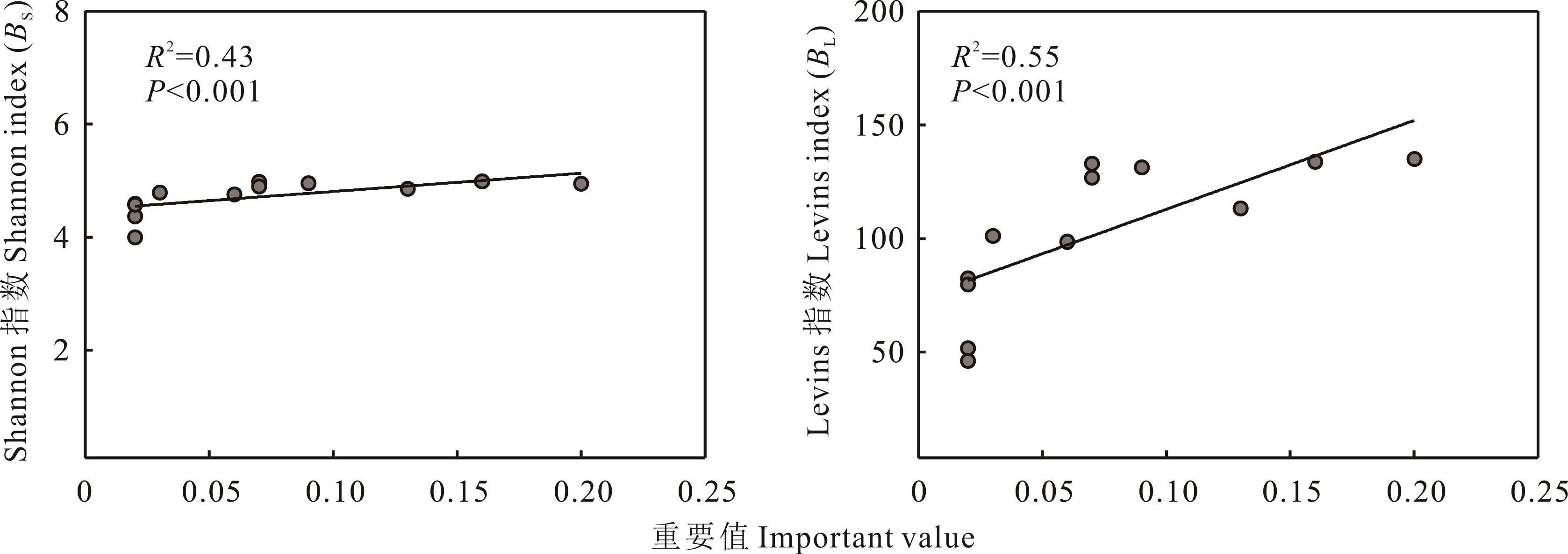 编号 No. | 优势物种 Dominant species | 重要值 Importance value | 生态位宽度 Niche breadth | |