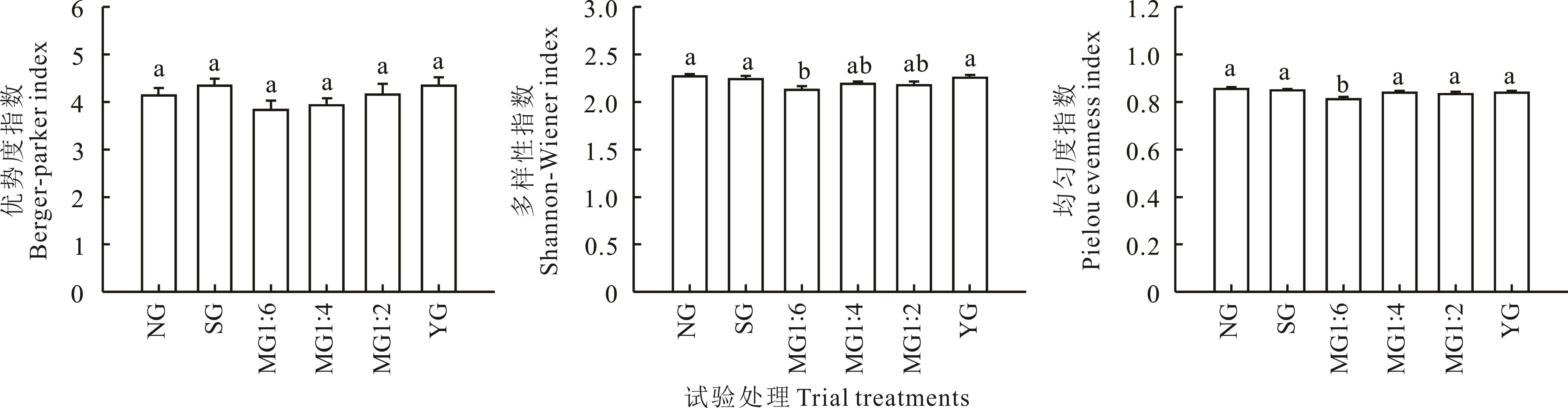 图5 不同放牧方式对优势植物种重要值的影响NG: 禁牧No grazing; SG: 藏羊单牧Only Tibetan sheep grazing; MG1∶6: 牦牛藏羊1∶6混牧Yak and Tibetan sheep grazing mixed as 1∶6; MG1∶4:牦牛藏羊1∶4混牧Yak and Tibetan sheep grazing mixed as 1∶4; MG1∶2:牦牛藏羊1∶2混牧Yak and Tibetan sheep grazing mixed as 1∶2; YG: 牦牛单牧Only yak grazing; 不同小写字母代表不同处理之间差异显著(P<0.05),下同. Different lowercase letters indicate significant differences among the different treatments at the 0.05 level, the same below.