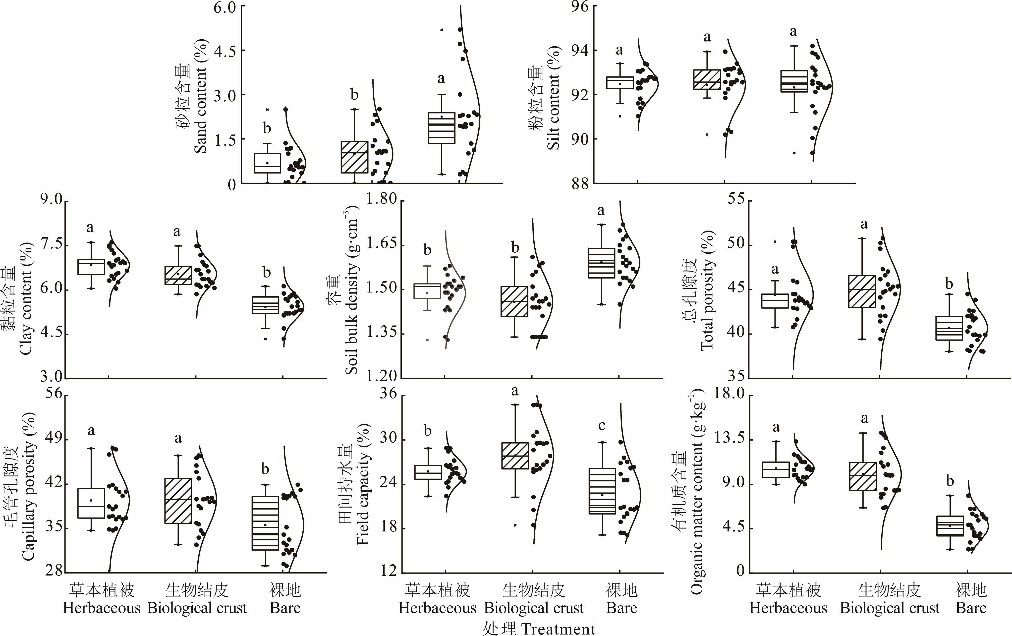 | 有机质Organic matter content | 结皮厚度Biological crust thickness | 毛管孔隙度 Capillary porosity | 砂粒含量Sand content | 合计Total | |||