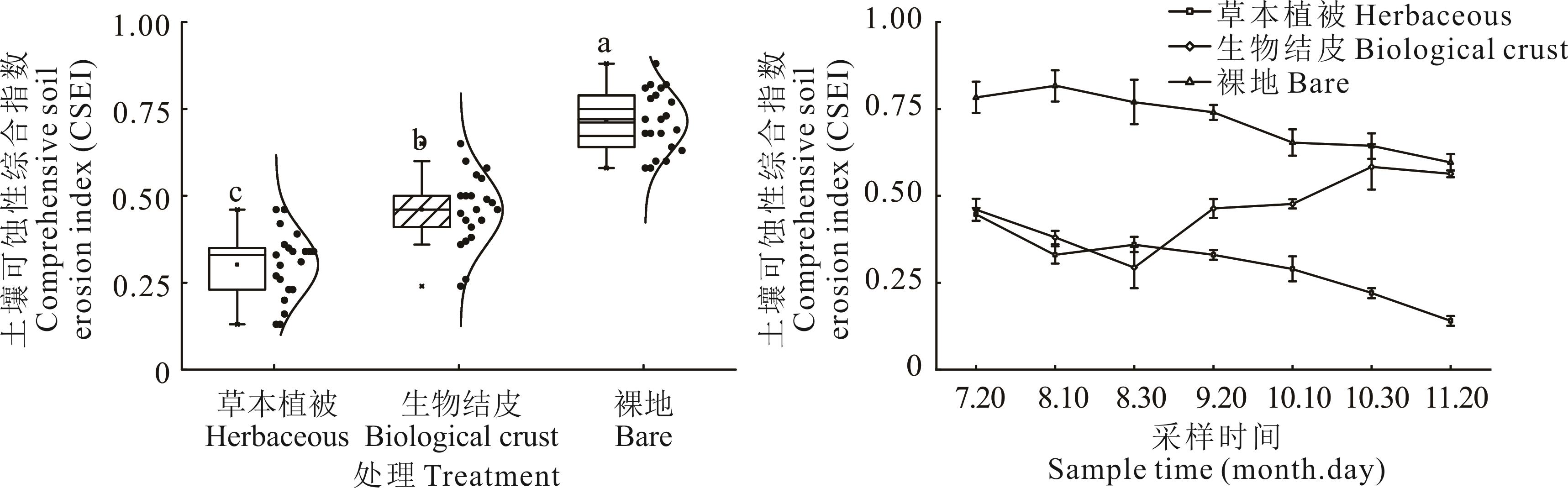 西南丘陵山区新建梯田边坎易受到降水冲刷,进而形成侵蚀沟,导致严重的水土流失问题。本研究在重庆市石柱县新建高标准农田区选取了草本植被覆盖、生物结皮覆盖和裸地(对照)梯田边坎,探究了典型地表覆盖物对梯田边坎土壤可蚀性的影响。结果表明,相较于裸地边坎,草本植被覆盖和生物结皮覆盖显著提高了梯田边坎的土壤饱和导水率、团聚体平均质量直径、平均水滴数和粘聚力,显著降低了梯田边坎土壤可蚀性K因子、崩解速率、最大崩解率和土壤可蚀性能综合指数(CSEI)。与裸地边坎相比,草本植被覆盖和生物结皮覆盖边坎的CSEI分别降低了57.7%和35.6%,然而,不同覆盖类型的梯田边坎在不同生长周期内CSEI的变化规律存在差异:裸地和草本植被覆盖的CSEI呈逐渐减小趋势,裸地CSEI由0.82减小到0.60,草本植被CSEI由0.45减小到0.14;而生物结皮覆盖的CSEI则表现为先减小后增大,CSEI由7月的0.45减小到8月的0.24,然后增大到11月的0.58。通径分析表明,草本植被覆盖边坎CSEI变化主要由植被生长驱动的土壤结构变化引起;生物结皮覆盖的边坎变化则与生物结皮的固结作用密切相关;裸地边坎的变化则主要受有机质含量变化的影响。本研究揭示了梯田边坎不同覆盖类型对土壤可蚀性的影响机制,为提升梯田边坎稳定性提供了理论支持和实践依据。