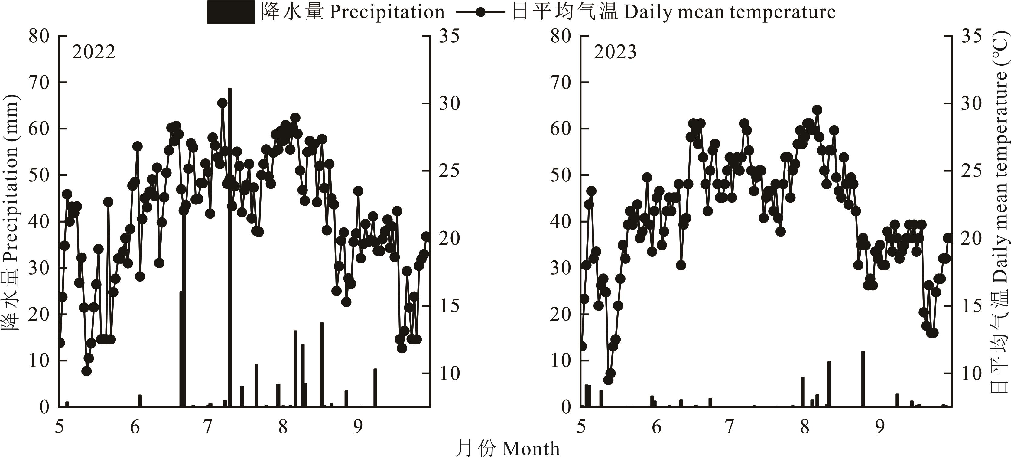 图1 2022和2023年春玉米生育期试验地日平均气温和降水量