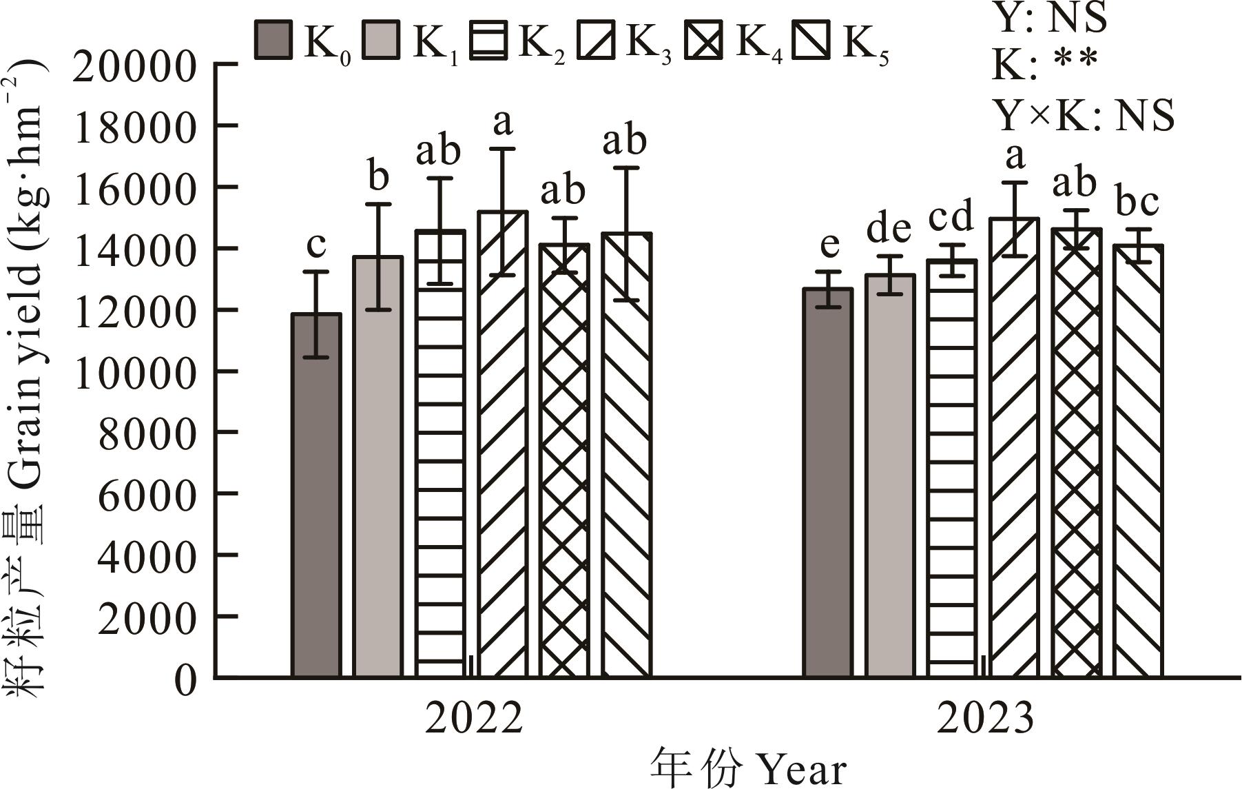 图2 不同施钾量下玉米干物质积累的变化K0、K1、K2、K3、K4、K5表示钾肥用量分别为 0、60、120、180、240、300 kg·hm-2;不同小写字母表示同一时期各处理在P<0.05水平差异显著。Y、K、Y×K分别表示年份、施钾量、年份与施钾量的交互效应。**与*分别表示变量效应达到0.01和0.05显著水平,NS表示效应不显著。下同。The potassium dosage in K0, K1, K2, K3, K4, K5 treatments were 0, 60, 120, 180, 240, 300 kg·ha-1, respectively; Different lowercase letters indicate significant differences among different treatments at the P<0.05 level for the same period. Y, K, and Y×K denote the interaction effects of year, potassium application, and interactive effect of year and potassium application, respectively. ** and * indicate variable effect at 0.01 and 0.05 significant levels, NS indicates not significant. The same below.