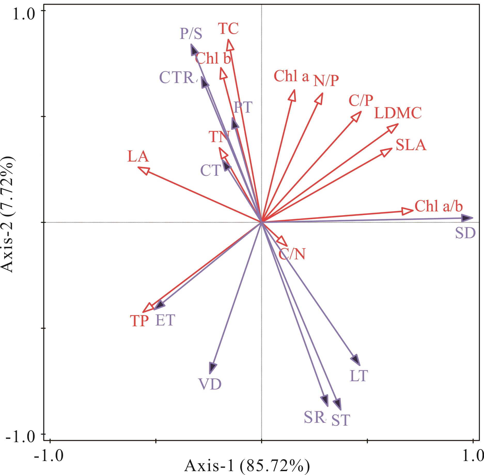 图4 5种菊科植物的叶片解剖结构与其生理化学性状的关系叶片生理化学性状用红色箭头表示,叶片解剖结构用蓝色箭头表示。箭头与箭头之间的夹角越小, 正相关性越强。Leaf physiological and chemical traits are represented by red arrows and leaf anatomical structure is represented by blue arrows. The smaller the angle between arrows, the stronger the positive correlation.