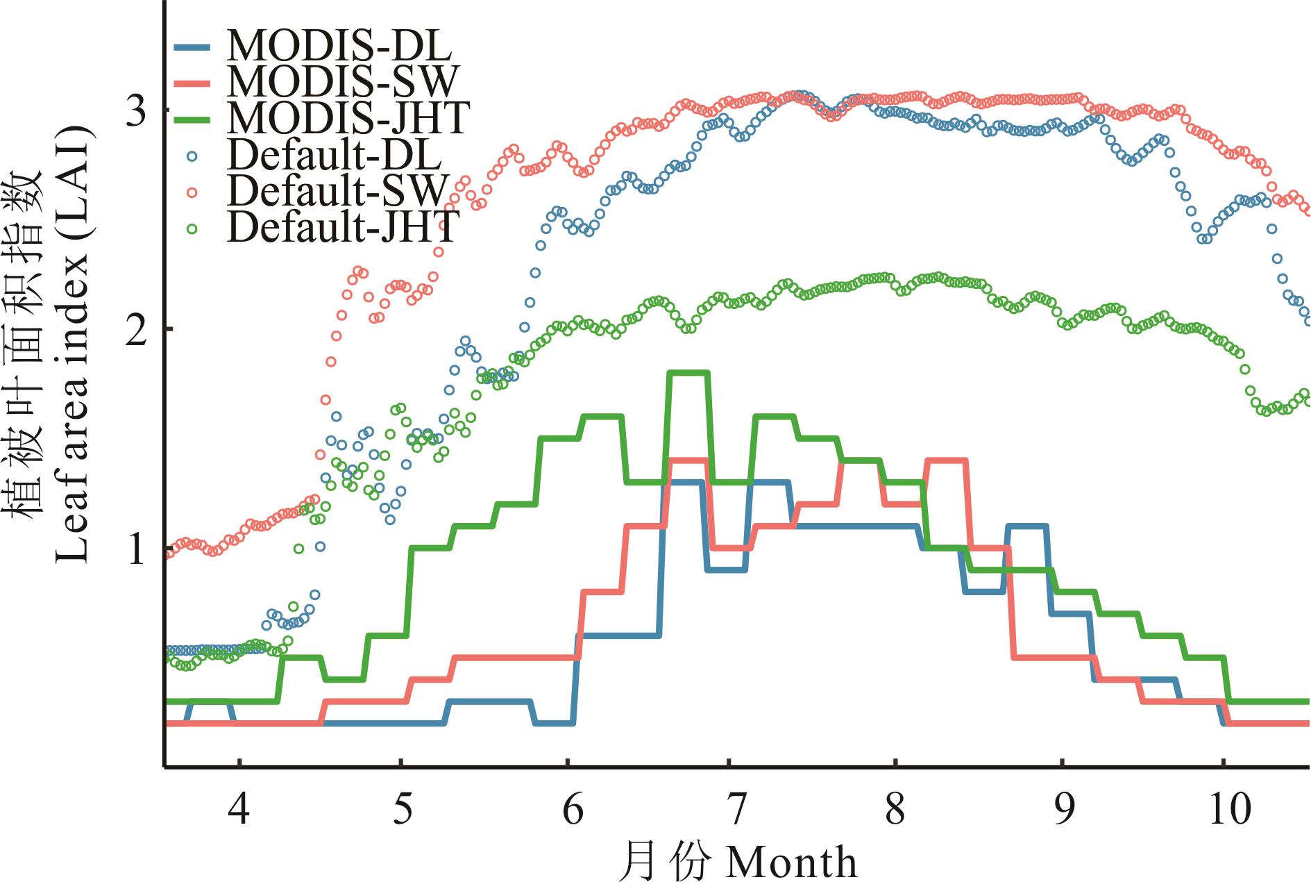 图2 各站点模型默认叶面积指数和MODIS叶面积指数季节变化情况折线表示MODIS LAI数据,空心圆表示CoLM陆面模式默认叶面积指数数据,分别用MODIS和Default表示。Broken lines represent MODIS LAI data, hollow circles represent Common Land Model default leaf area index data, it is represented by MODIS and Default respectively.