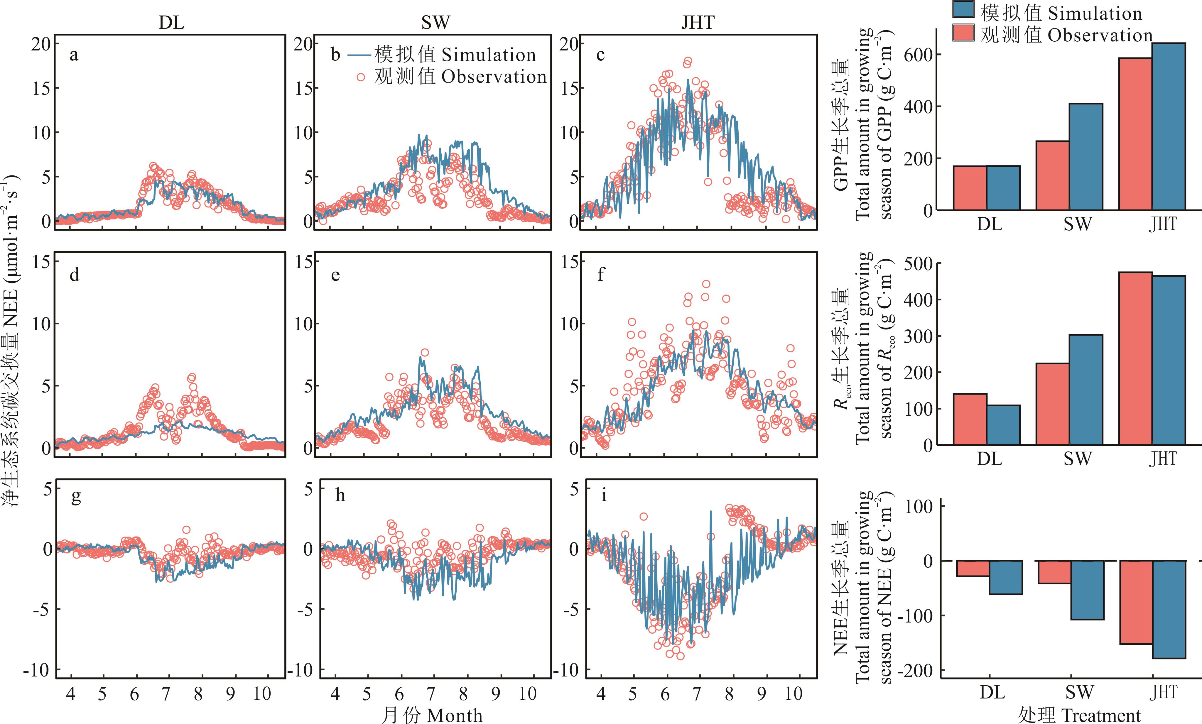 图8 CoLM陆面模式对温性草原(DL)、荒漠草原(SW)、山地草甸(JHT)碳通量模拟值与观测值生长季变化趋势及碳总量