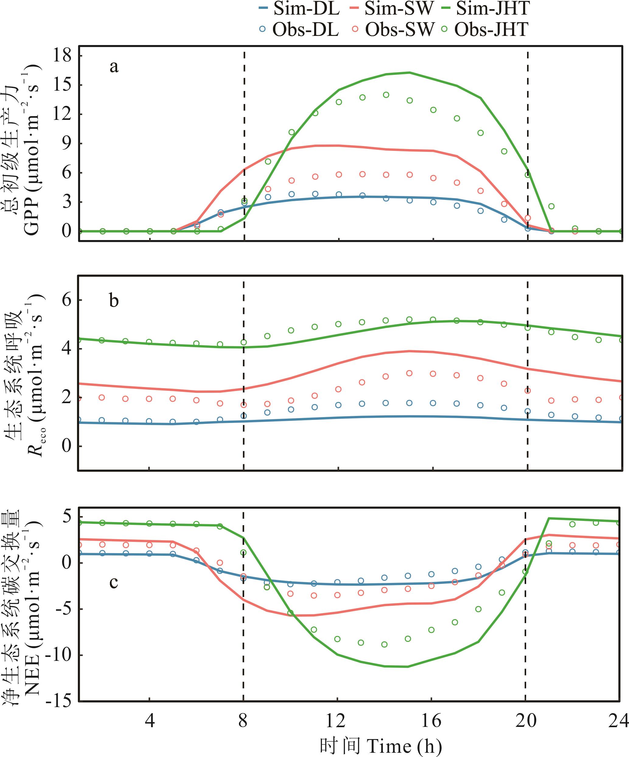 图7 CoLM陆面模式对温性草原(DL)、荒漠草原(SW)、山地草甸(JHT)碳通量模拟值与观测值的比较GPP: 总初级生产力Gross primary productivity; Reco: 生态系统呼吸Ecosystem respiration; NEE: 净生态系统交换量Net ecosystem exchange; 下同The same below; 生长季碳通量时间尺度为30 min The time scale of 30 min for carbon flux in the growing season.