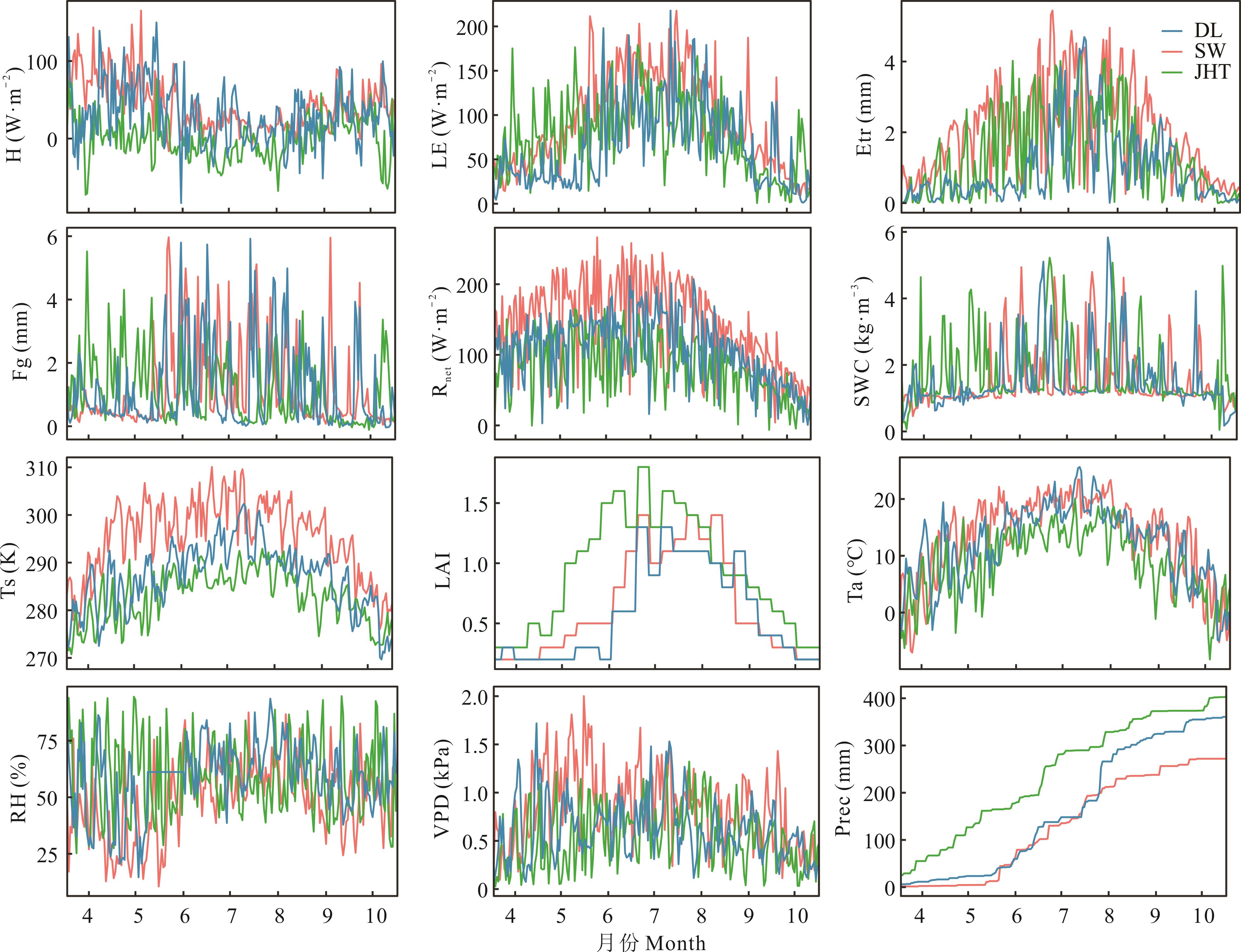 图10 温性草原(DL)、荒漠草原(SW)、山地草甸(JHT)生长季碳水通量环境因子变化趋势