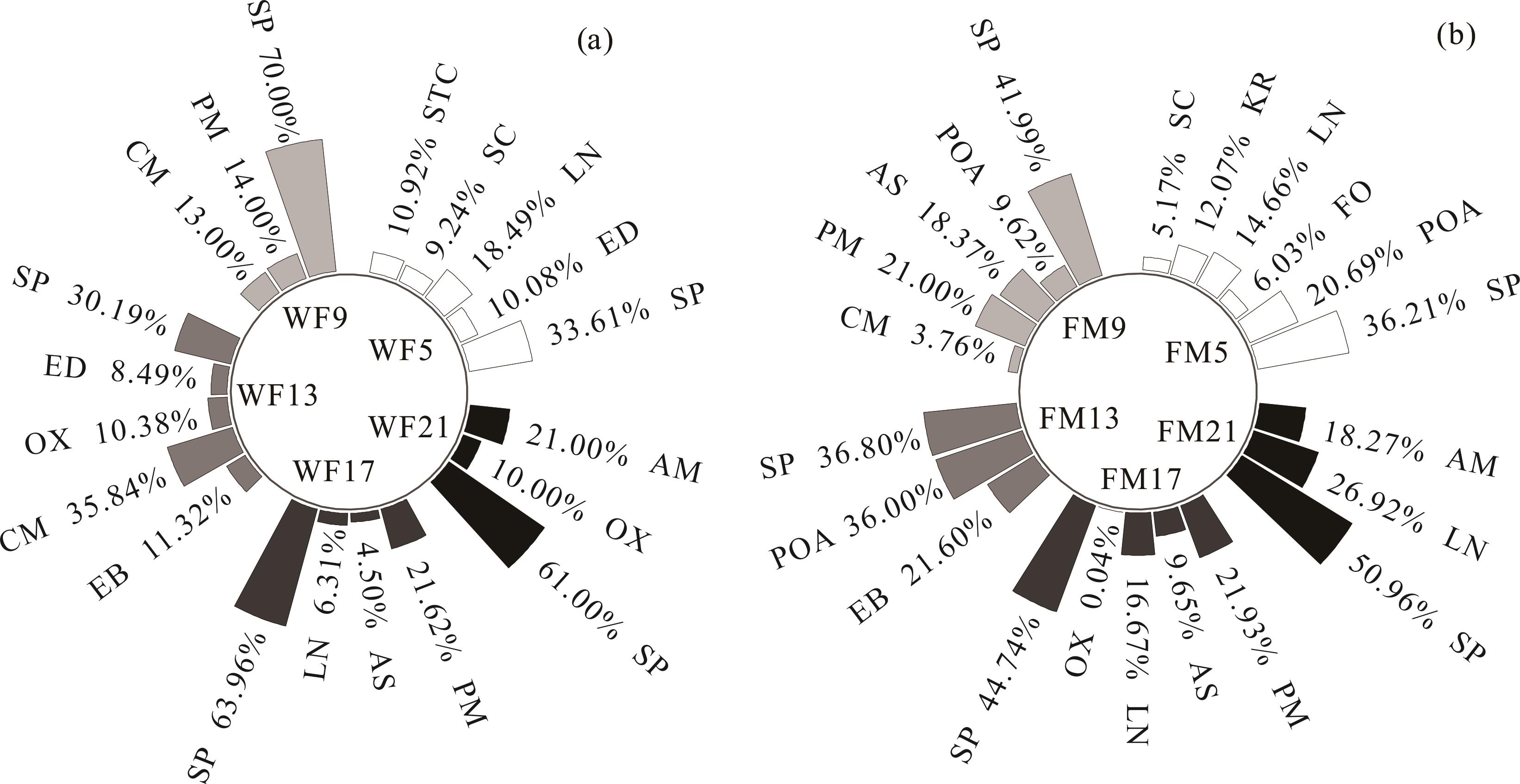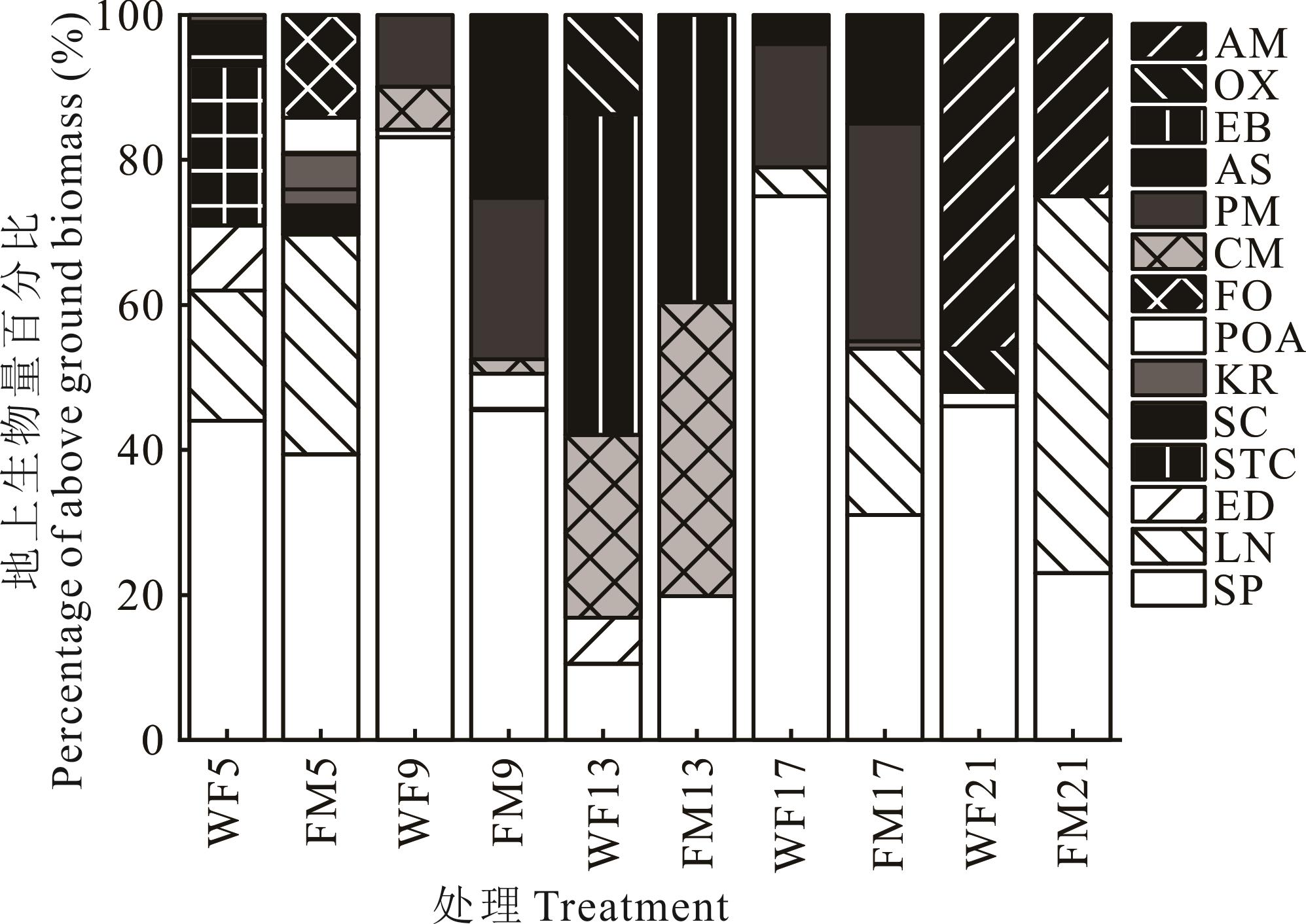 图 1 围封对优势种重要值的影响WF5, WF9, WF13, WF17, WF21分别为围封5, 9, 13, 17, 21年Enclosed for 5, 9, 13, 17, 21 years, respectively; FM5, FM9, FM13, FM17, FM21分别为放牧5, 9, 13, 17, 21年 Grazed for 5, 9, 13, 17, 21 years, respectively; SP: 紫花针茅S. purpurea; PM: 多裂叶委陵菜Potentilla multifida; CM: 青藏苔草Carex moorcroftii; ED: 披碱草Elymus dahuricus; OX: 棘豆Oxytropis; EB: 雪灵芝Eremogone brevipetala; LN: 矮火绒草Leontopodium nanum; AM: 昆仑蒿Artemisia manschanica; SC: 狼毒草Stellera chamaejasne; POA: 早熟禾Poa annua; AS: 阿尔泰狗娃花Aster altaicus; FO: 羊茅Festuca ovina; KR: 粗壮嵩草Kobresia robusta; STC: 西藏风毛菊Saussurea tibetica; 下同The same below.