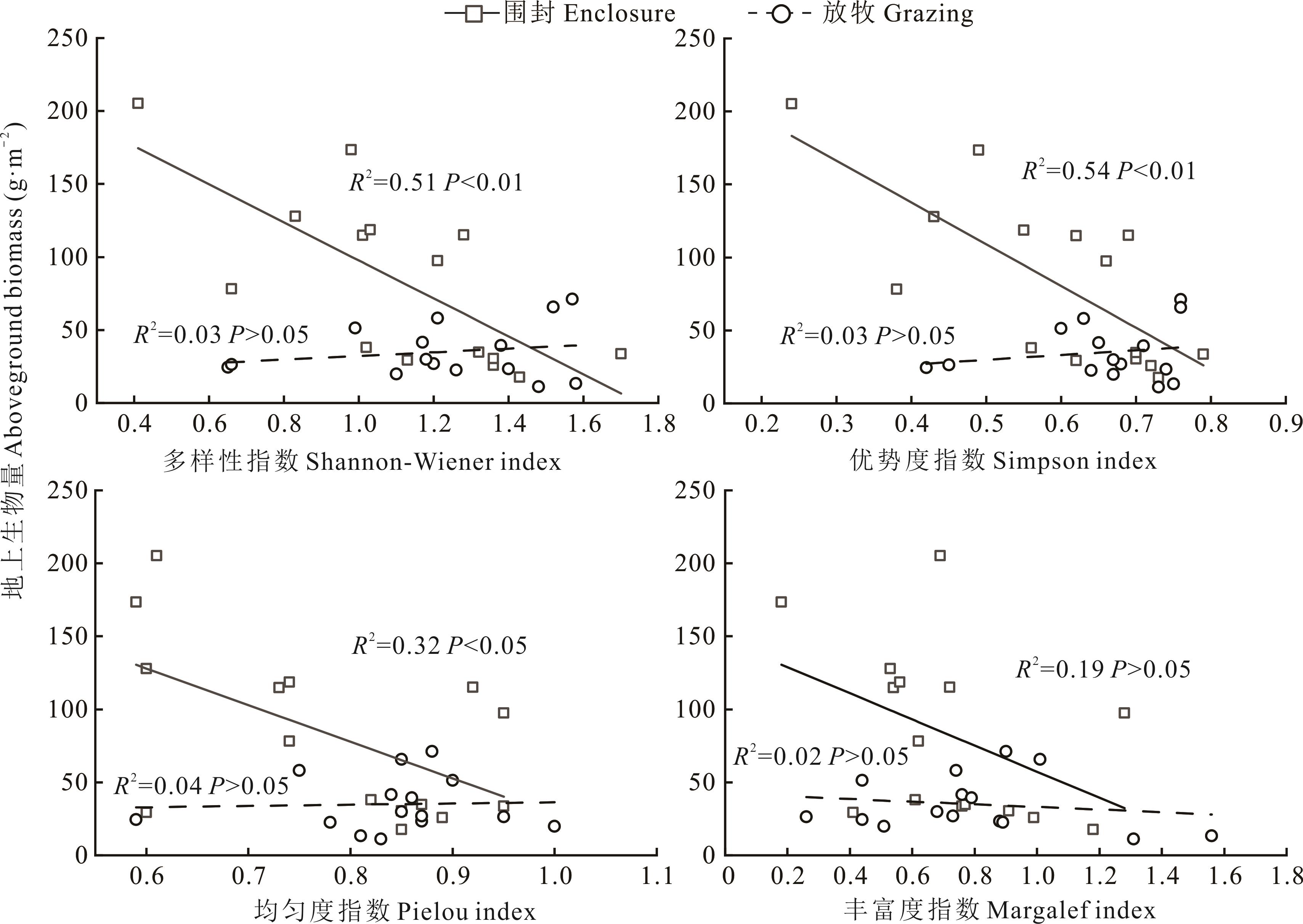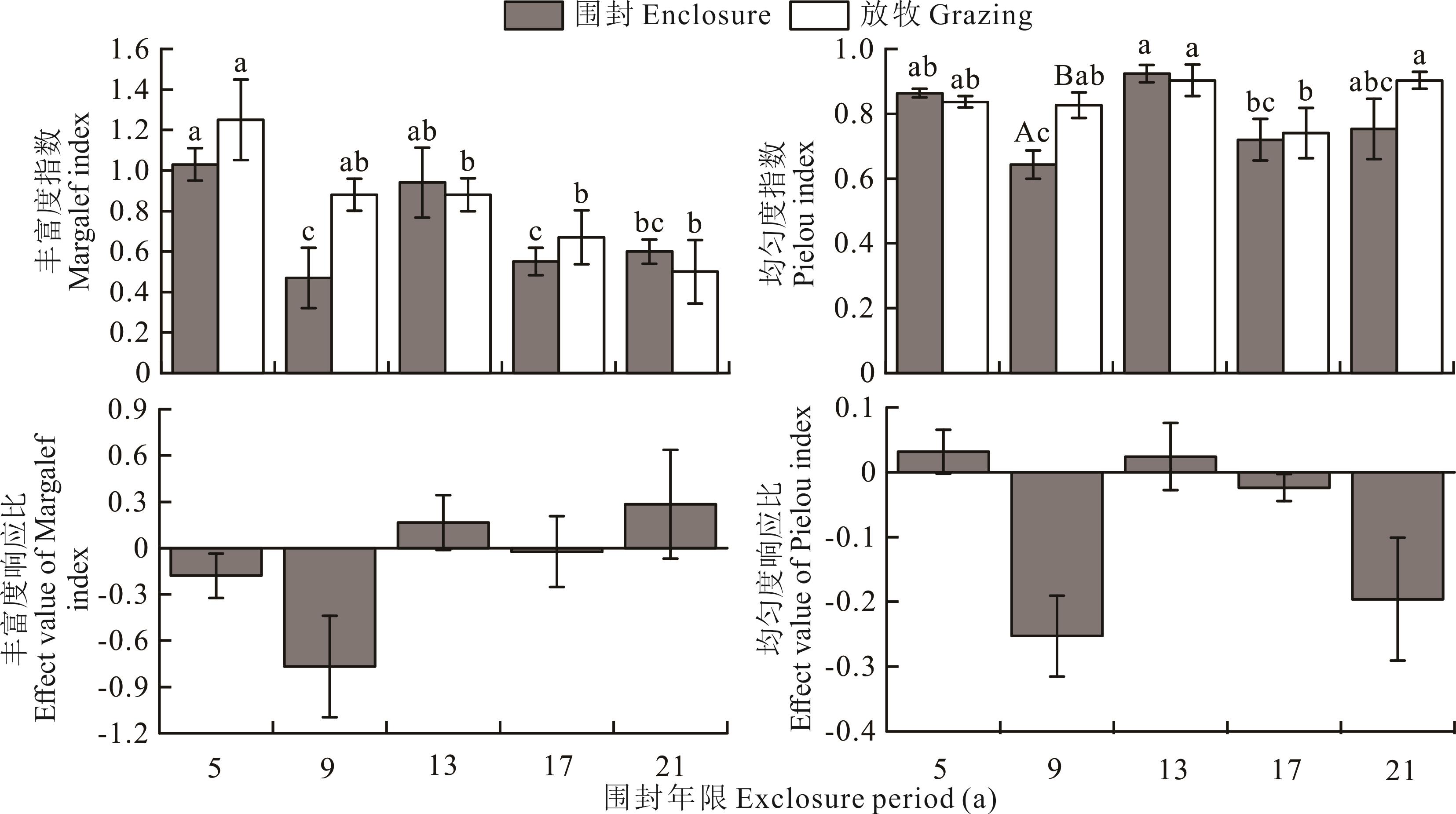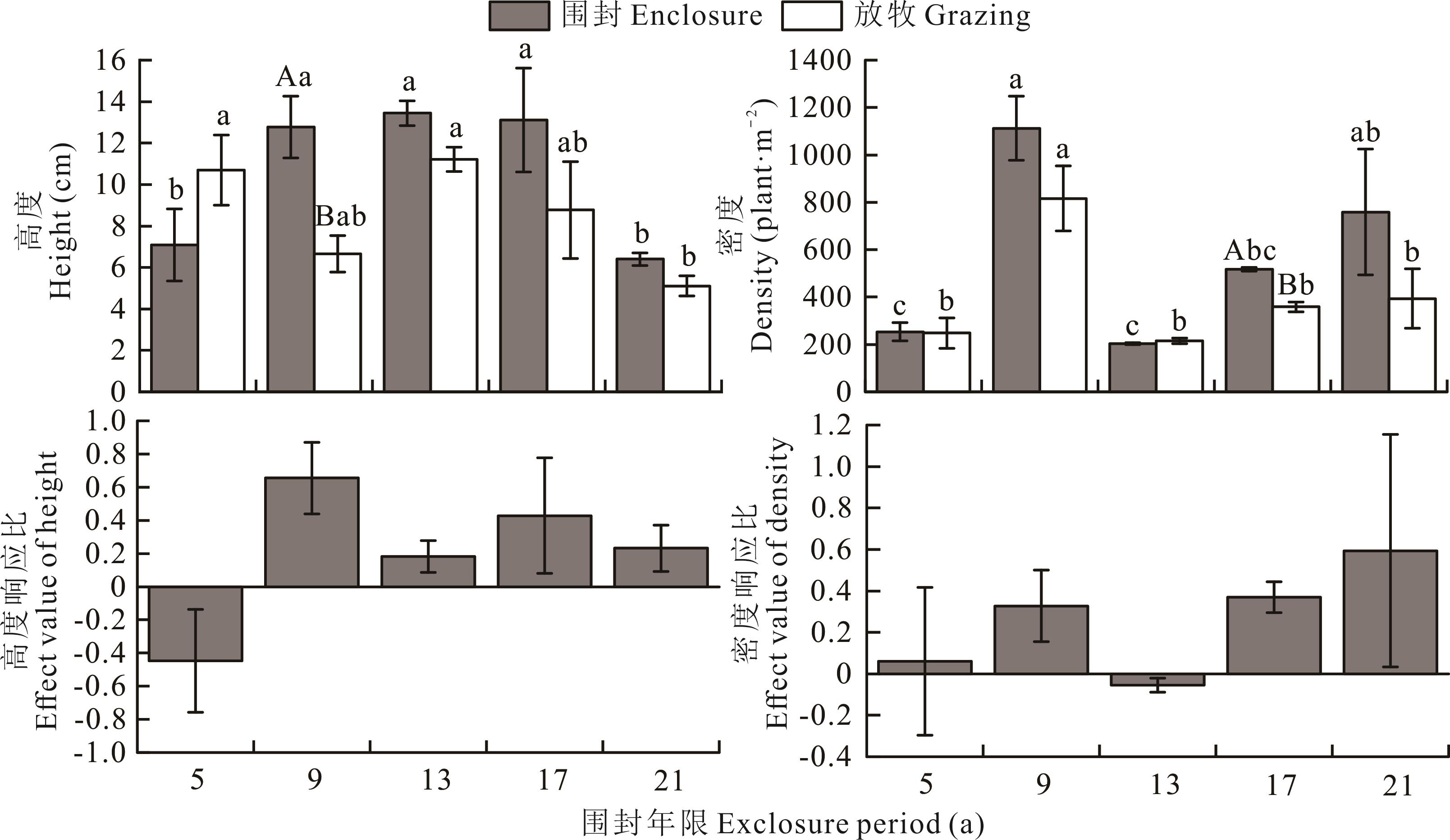 图2 围封对地上生物量、盖度特征的影响不同大写字母表示两种不同处理间差异显著(P<0.05),不同小写字母表示在同一处理下不同年限间差异显著(P<0.05),下同Different capital letters indicate significant differences between the two different treatments (P<0.05), while different lowercase letters indicate significant differences among different durations within the same treatment (P<0.05), the same below.