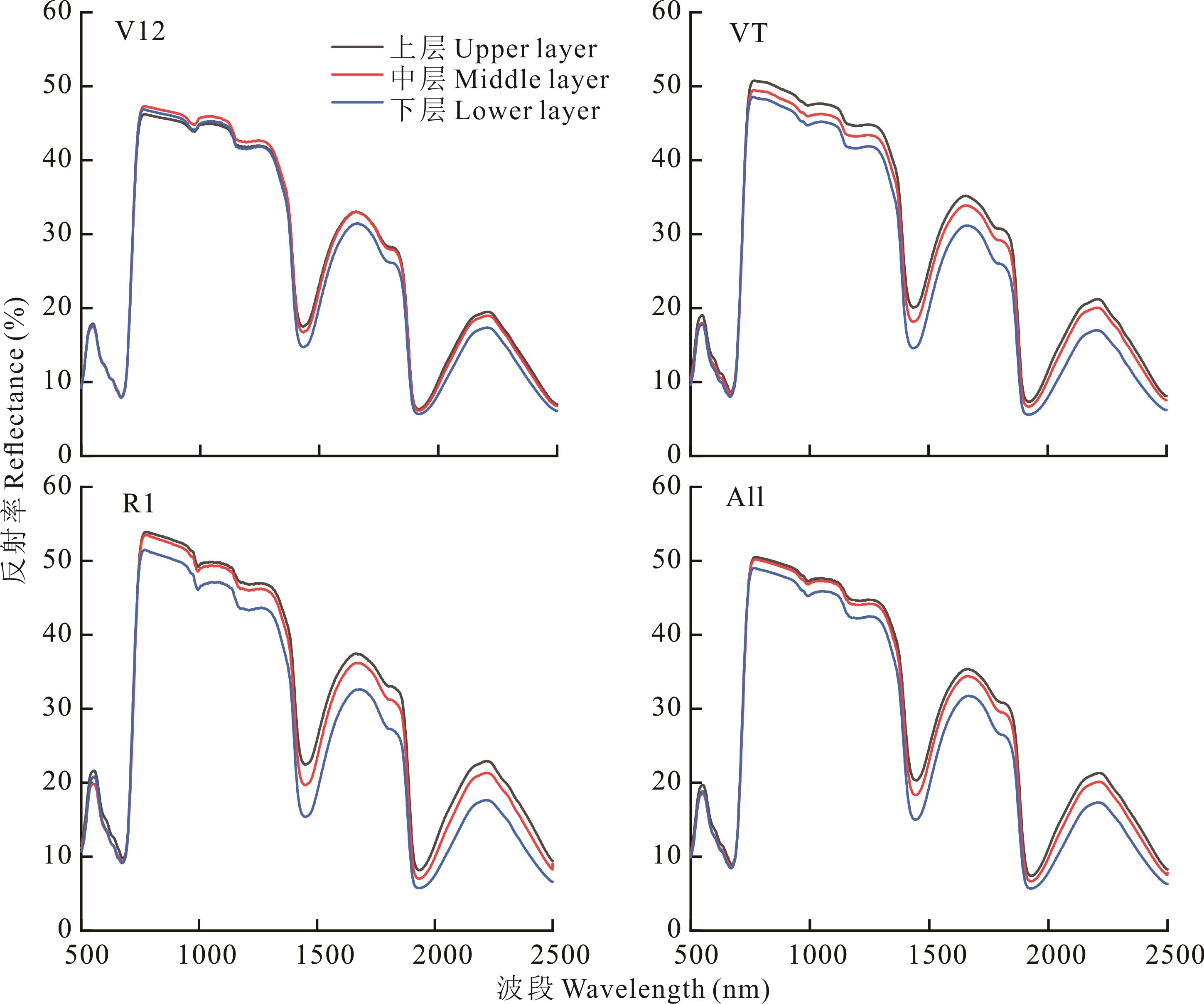 | 光谱指数Spectral index | 大喇叭口期V12 | 抽雄期VT | 开花吐丝期R1 | 上层Upper | 中层Middle | 下层Lower | 全生育时期All |