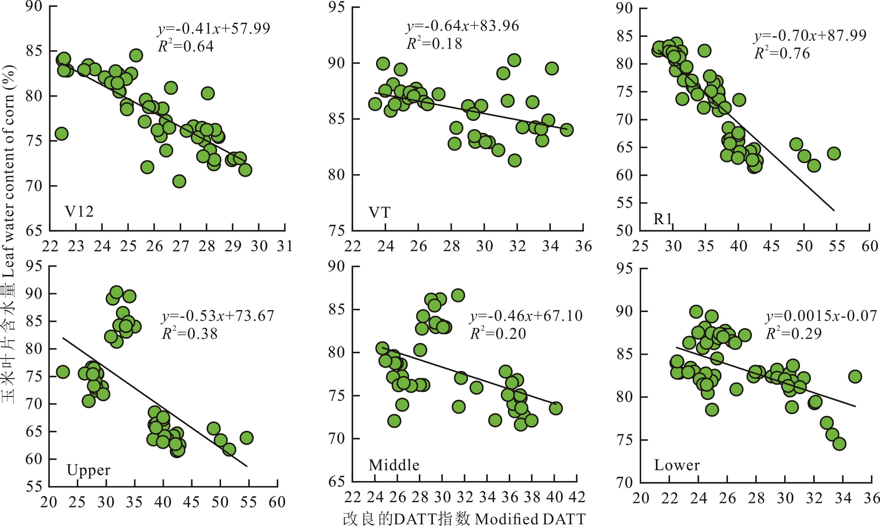 图3 改良的DATT指数在不同生育时期及层位下与玉米叶片含水量的线性相关关系