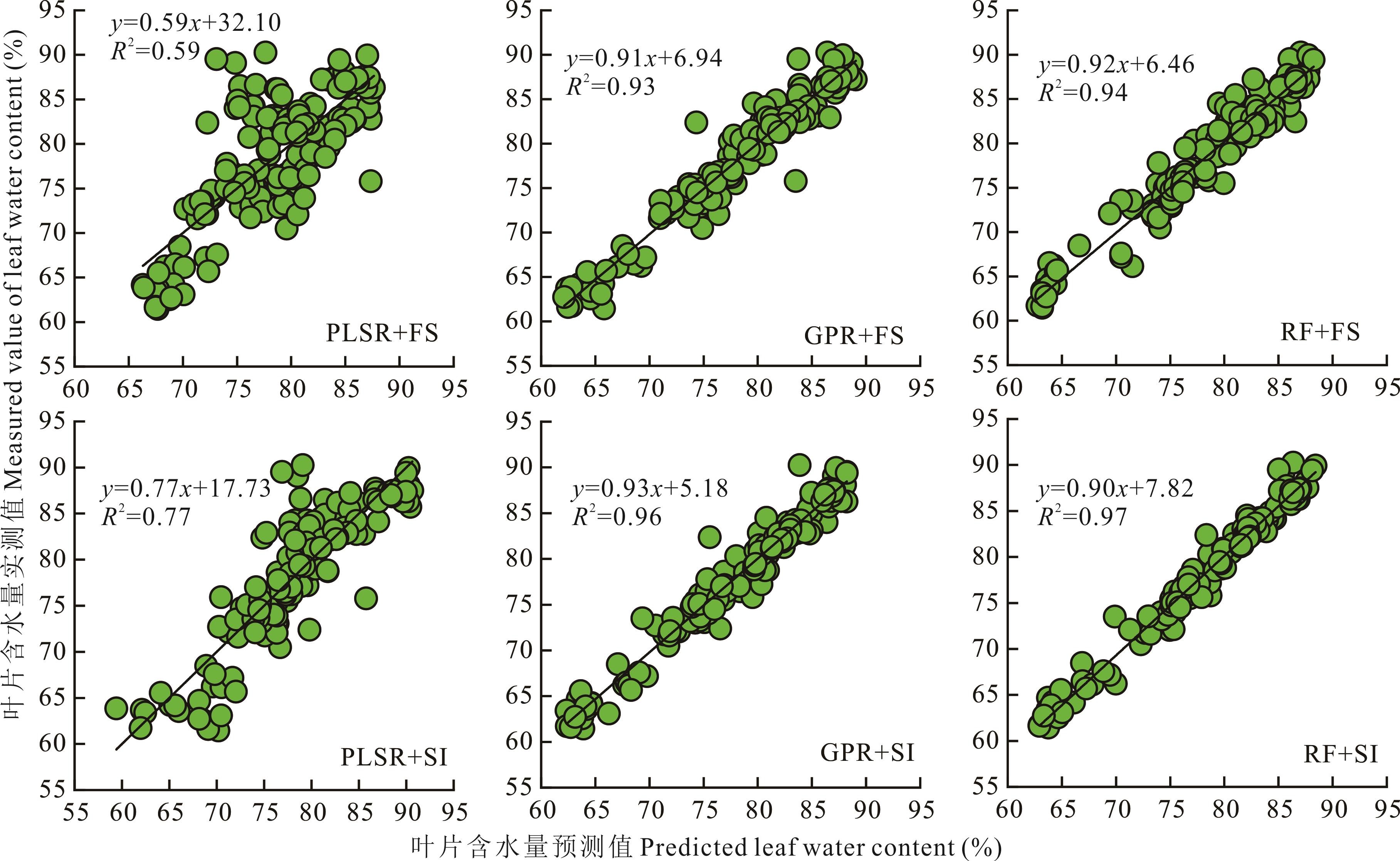 图5 基于全光谱数据集和光谱指数的玉米叶片含水量估测模型构建PLSR: 偏最小二乘回归Partial least squares regression; GPR: 高斯过程回归Gaussian process regression; RF: 随机森林Random forest; FS: 全波段: Full-spectrum; SI: 光谱指数Spectral index. 下同The same below.