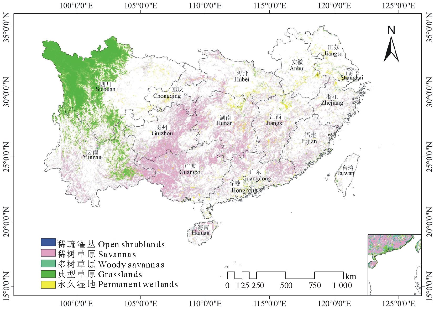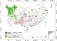 利用2009年的MOD12Q1土地覆盖分类产品数据, 参照国际地圈生物圈计划(IGBP)分类体系将稀疏灌丛(open shrublands)、稀树草原(savannas)、多树草原(woody savannas)、典型草原(grasslands)、永久湿地(permanent wetlands)等5种土地利用类型划归南方草地, 在此基础上构建出南方草地分布图[18]。