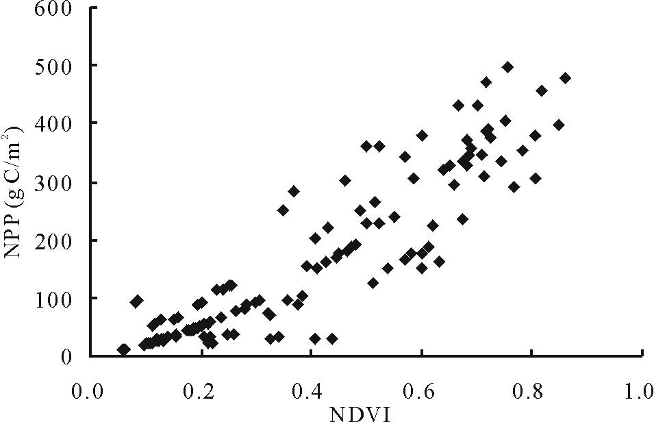 草地NPP是衡量草地固碳能力及草地生长状况的重要指标, 而NDVI在使用遥感图像进行植被研究以及植物物候研究中得到广泛应用, 它是植物生长状态以及植被空间分布密度的最佳指示因子, 与植被分布密度关系密切。本研究利用南方草山草坡的地面样方实测NPP数据以及对应位置同一月份的NDVI数据, 分析其相关性(图2)。随着NDVI值的增加, 草地NPP的值也随之增加, 两者存在统计上的正相关关系, 说明利用NDVI作为遥感植被指数估算草地NPP是可行的。
